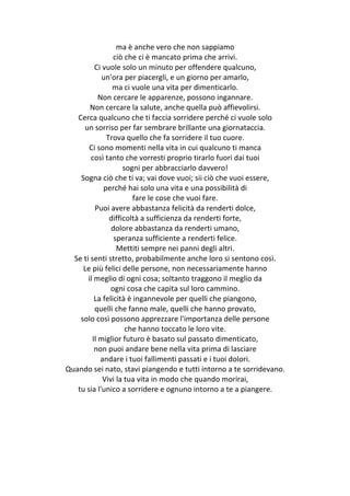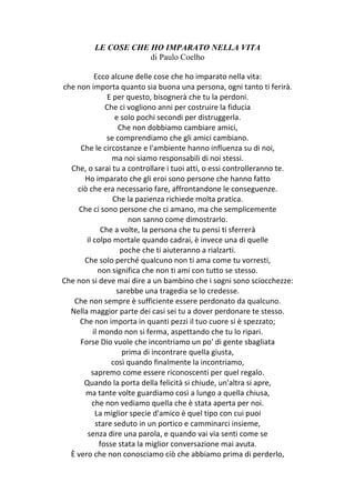 Il documento riassume le lezioni di vita apprese da Paulo Coelho, tra cui il valore del perdono, l'importanza della pazienza e il fatto che le circostanze influenzano ma non determinano la nostra vita. Viene sottolineato che le relazioni e le esperienze contribuiscono alla crescita personale e che la ricerca della felicità richiede un approccio autentico e consapevole. Infine, il testo invita a riflettere su come apprezzare ciò che abbiamo, dare valore ai legami umani e imparare dai fallimenti.