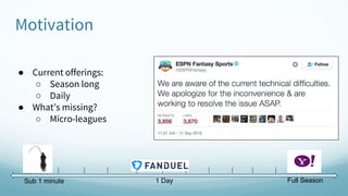 Paul Singman proposes micro-leagues for fantasy football, where a full season is simulated in under a minute. He ingested play-by-play data from SportRadar into Kafka using Kinesis Producer and simulated plays at 300 per second. The architecture uses Apache Spark and Cassandra on AWS with windowed streaming to optimize reads, writes and queries.