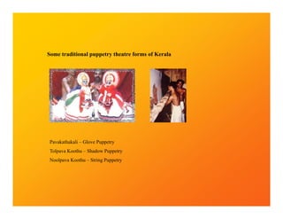 This document provides information about traditional puppet theatre forms in Kerala, India, including Pavakathakali glove puppetry. It describes the history and evolution of puppet theatre in the region. The puppets used in Pavakathakali are made of wood and cloth and stand one to two feet tall. The art form was created to teach children about Kathakali theatre in a condensed form lasting one to two hours. It does not have a dedicated stage and uses the same musical instruments as Kathakali. The document outlines a Pavakathakali performance depicting the defeat of Duryodhana by Bhima that was observed and documented.