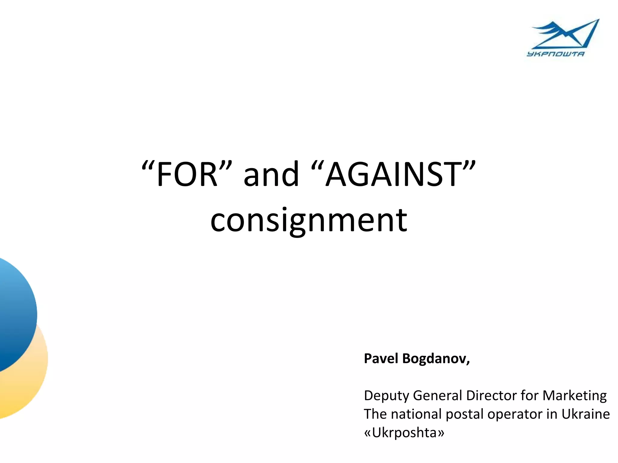Ukrposhta is Ukraine's national postal operator with over 98,000 employees and 4,229 vehicles delivering mail. Consignment is an international postal service that allows distance sellers to regularly send mailings from one country to another or several countries through a central collection and distribution point. Using consignment, catalog companies can send orders to Ukrposhta which then delivers the parcels to customers in Ukraine without payment of customs duties or VAT. Ukrposhta has consignment agreements with several European postal operators and introduced a new service between Ukraine and Russia allowing purchases from Russian shops. Consignment offers advantages over direct import like no certification requirements but longer delivery times, while direct import is faster but requires certification and payment