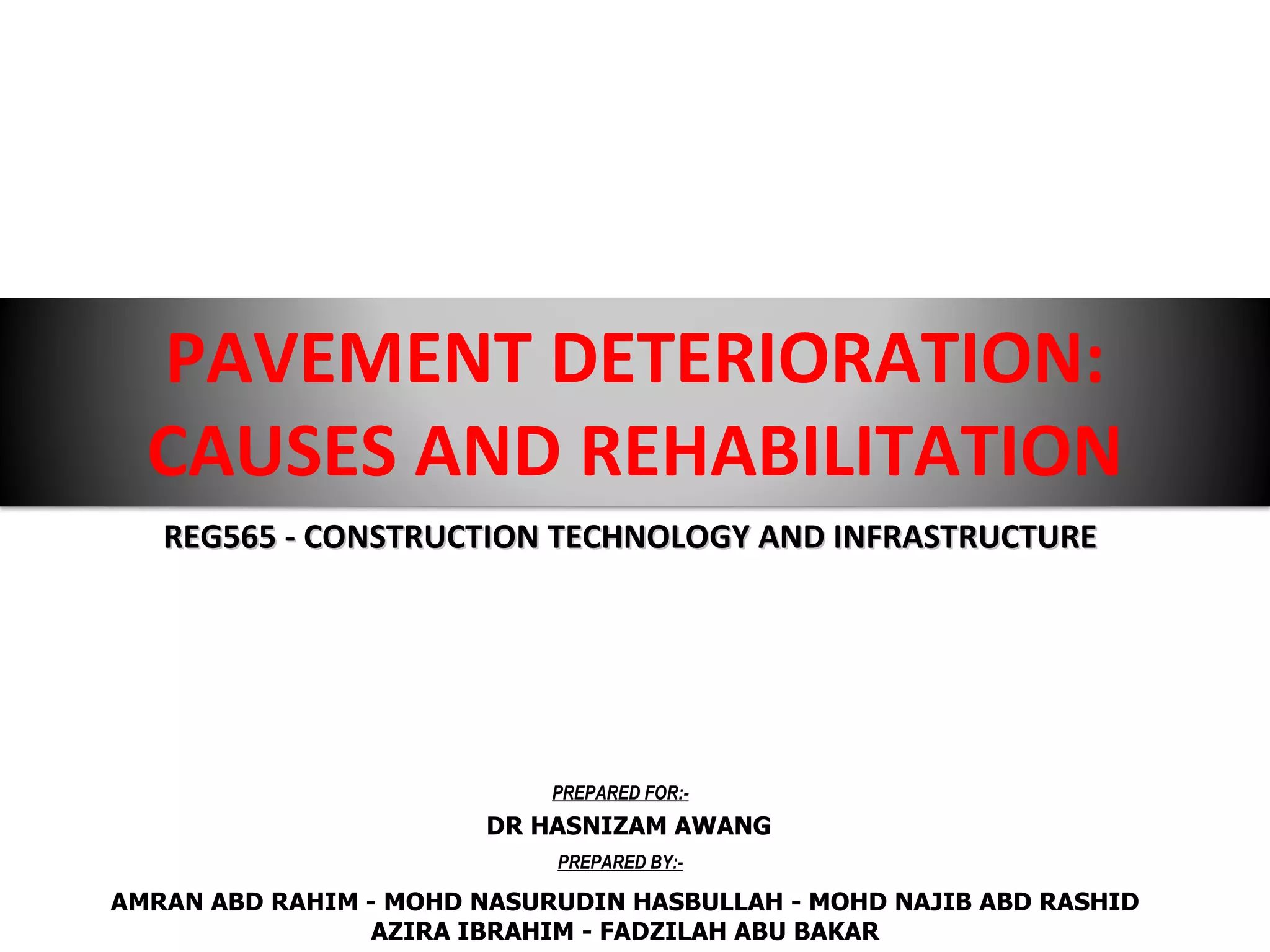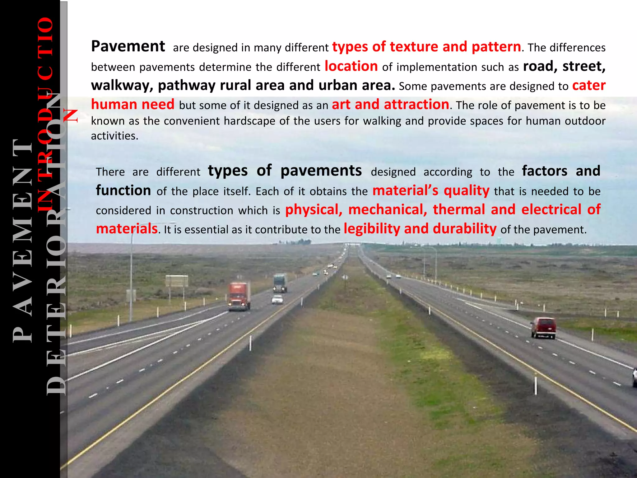 There are many different types of pavements designed for various locations and purposes. Pavements deteriorate over time due to factors like weather, traffic loading, temperature changes, and moisture movement in the subgrade. Common types of pavement deterioration include cracking, rutting, and pothole formation. Routine maintenance such as grass cutting and gully emptying helps prolong pavement life, while more serious issues require structural maintenance like patching, resurfacing, or adding road markings. Proper maintenance is needed to keep pavements functioning well and ensure safety.