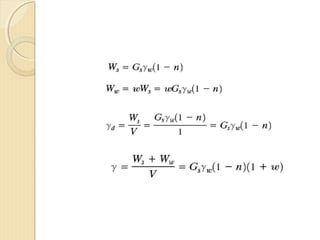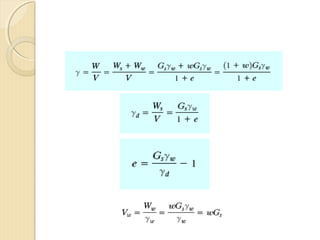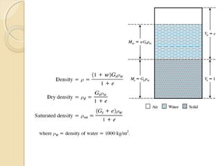 This document provides information about pavement materials engineering. It discusses the relationships between different phases in soil, including solid particles, water, and air. Key terms discussed include density, unit weight, specific gravity, voids ratio, porosity, degree of saturation, bulk unit weight, dry unit weight, and saturated unit weight. Examples are provided to demonstrate how to calculate volumes, weights, moisture content, and other properties for soil samples. Relationships between these various properties are also examined.