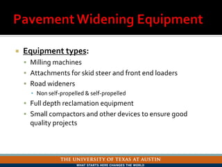 The document details various types of equipment used for road widening and full depth reclamation, including milling machines and attachments for skid steers and front-end loaders. It outlines the operational challenges and lessons learned with non-self-propelled machinery, emphasizing equipment suitability for project size and the importance of matching equipment type to specific tasks. Additionally, it recommends technical practices to improve project quality and efficiency, such as enhancing material processing techniques.