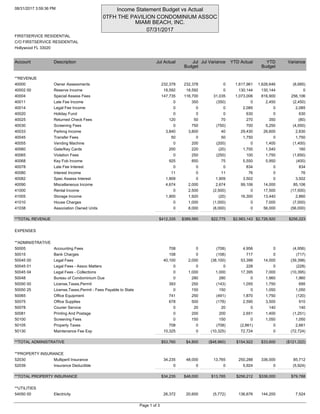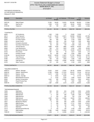 The income statement shows the budget vs actual revenues and expenses for The Pavilion Condominium Association for July 2017. Revenues were higher than budgeted by $22,775 primarily due to higher than expected special assessment fees. Expenses were over budget by $102,853 mainly because of higher than anticipated legal fees, repairs and maintenance costs, and special projects expenses. This resulted in a net loss of $80,078 for July, compared to the budgeted net income of $0.