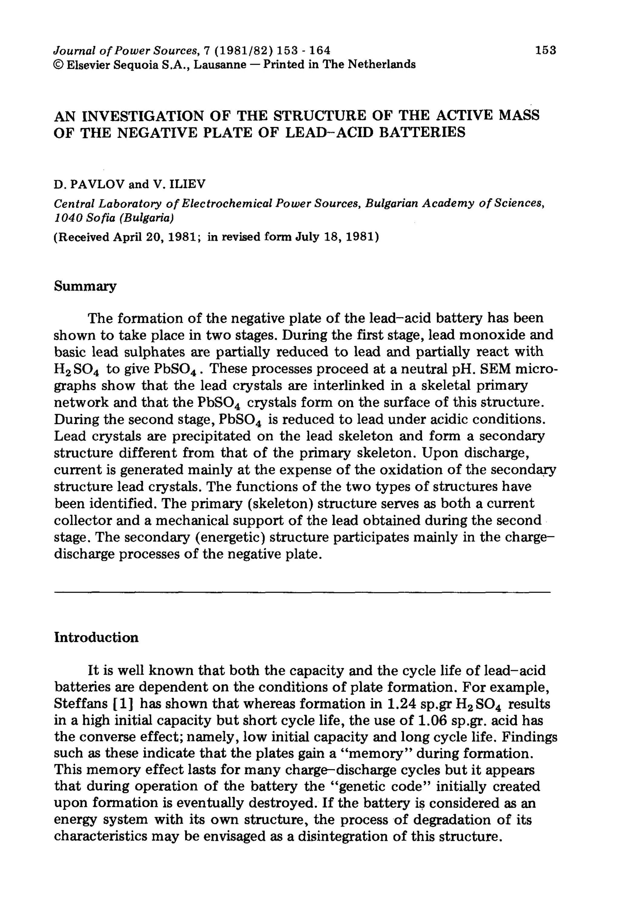 The document summarizes research on the structure of the negative plate in lead-acid batteries. It finds that plate formation occurs in two stages, resulting in two distinct lead crystal structures: