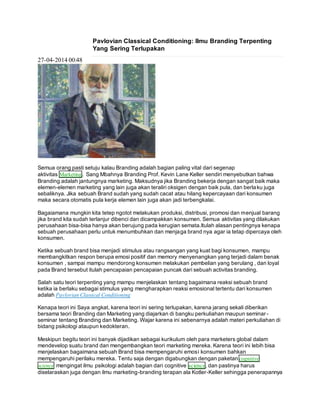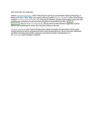 Teks tersebut membahas teori klasik Pavlov tentang kondisi klasik yang sering dilupakan dalam pembelajaran branding dan pemasaran. Teori ini menjelaskan bagaimana stimulus kondisi (merek) dapat menghasilkan respon emosional tertentu pada konsumen melalui proses pengkondisian berulang dari stimulus bersamaan.