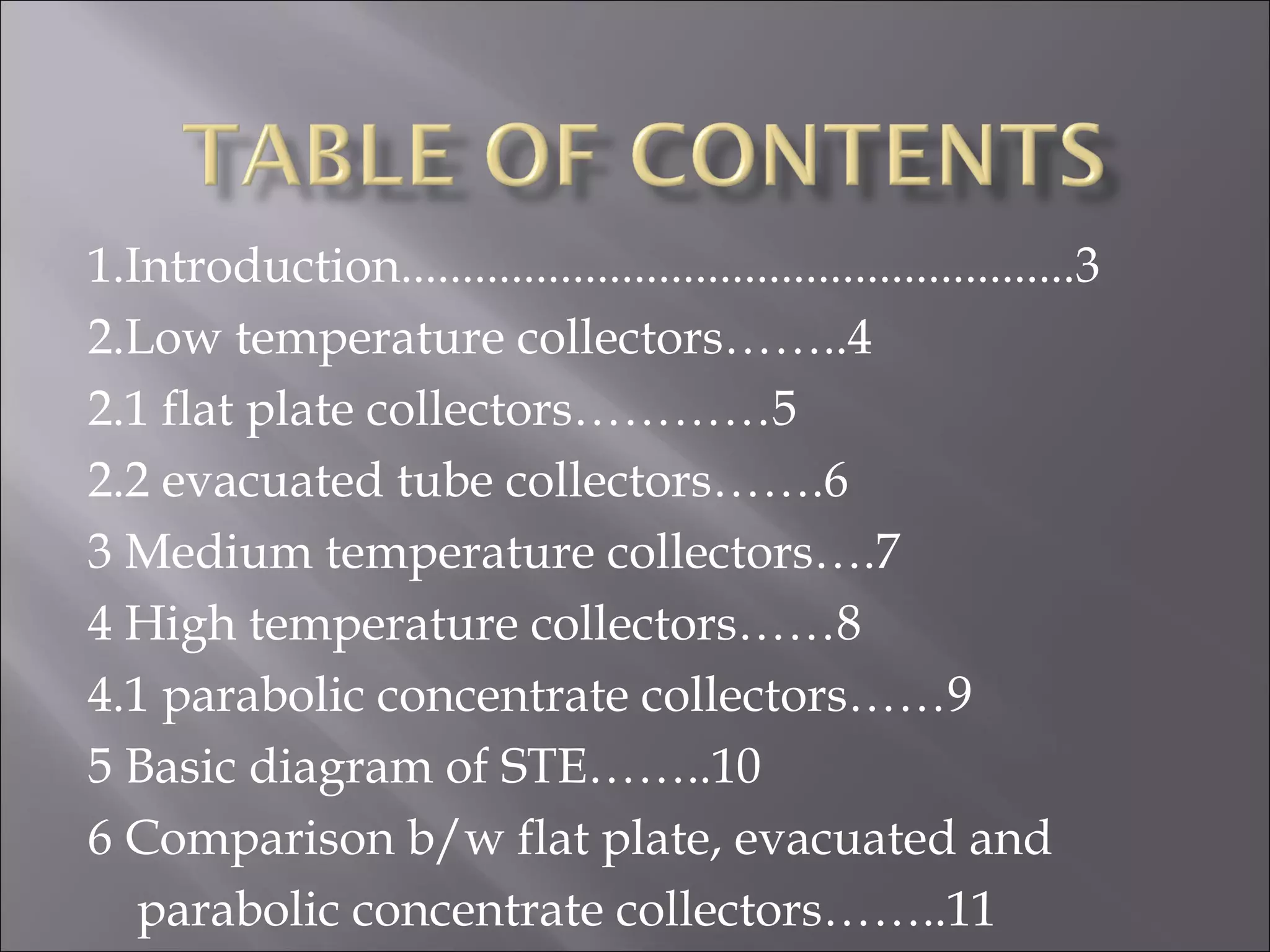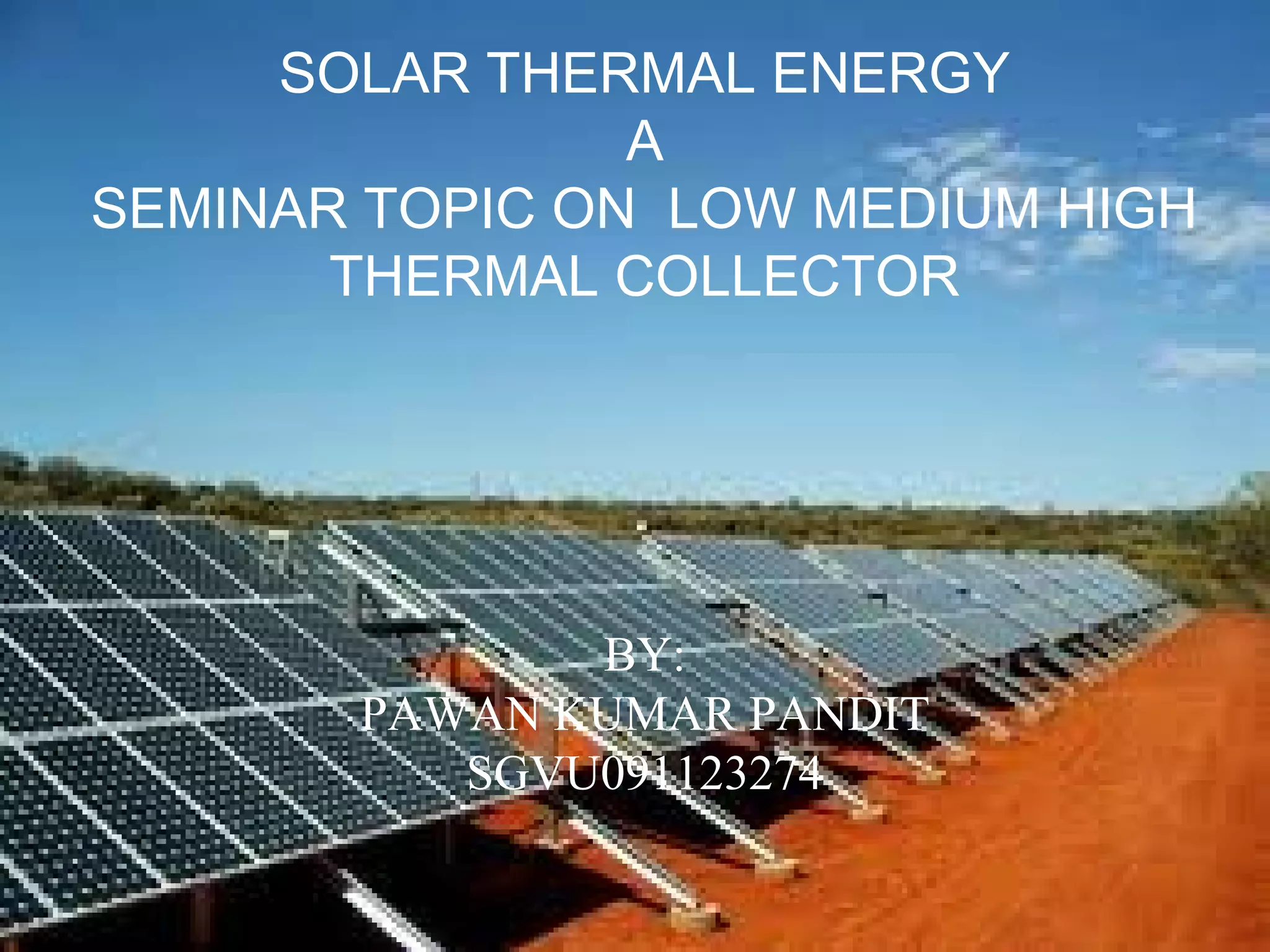 The document discusses solar thermal energy (STE), detailing various types of thermal collectors: low, medium, and high temperature, and their applications in energy generation and heating. It highlights the advantages of STE, including renewable energy benefits, while also noting disadvantages such as inefficiency at night and installation costs. The future of solar thermal technology looks promising with expected improvements in efficiency and cost savings in the coming years.