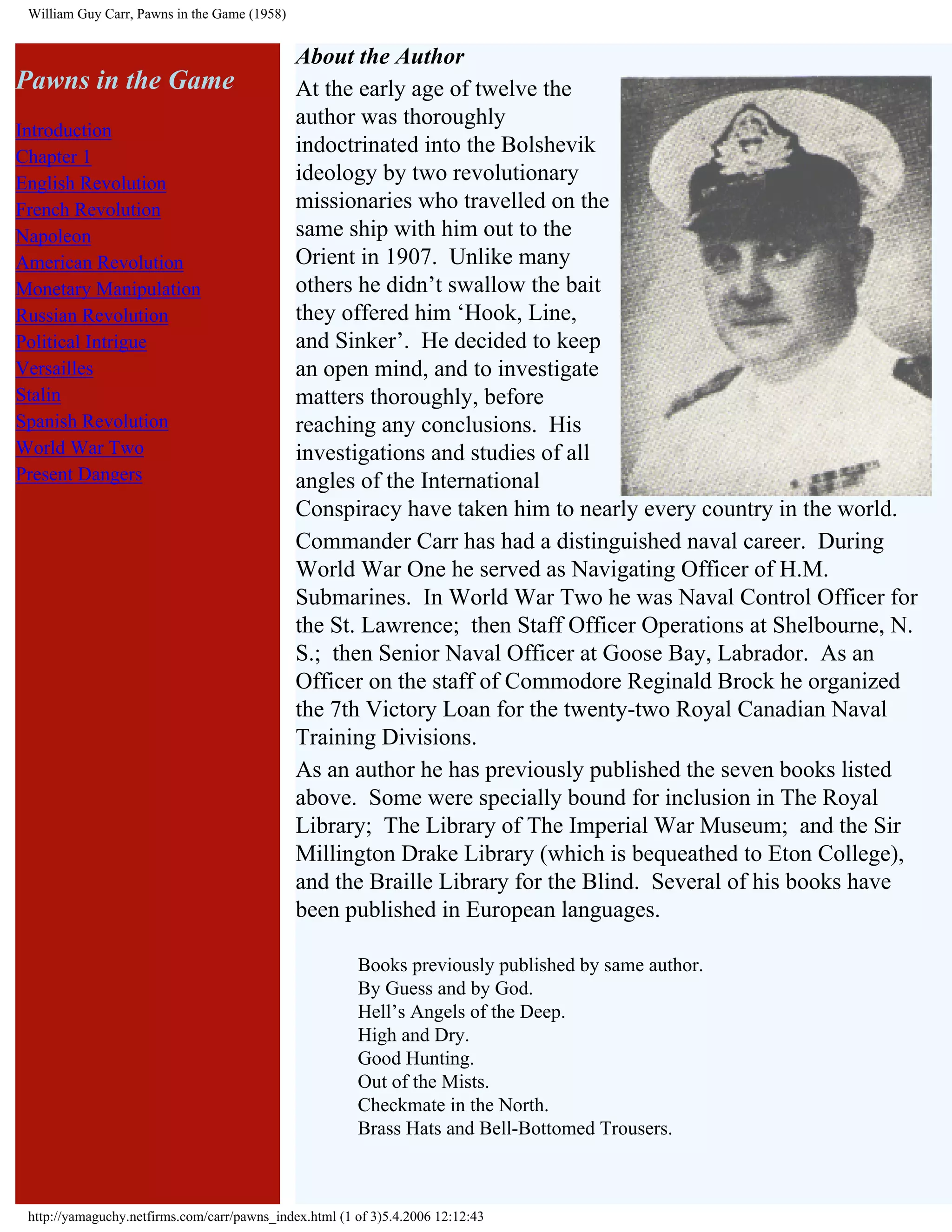 In 'Pawns in the Game,' William Guy Carr explores the existence of an international conspiracy impacting global events, including revolutions and wars, driven by both communists and capitalists aiming for totalitarian control. The book outlines historical manipulations and philosophical ideologies rooted in a 'luciferian conspiracy' that has evolved over centuries, culminating in modern threats facing society. Carr emphasizes the importance of awareness and education to combat these forces, offering insights and possible solutions to address the challenges posed by this alleged conspiracy.