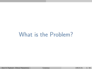 The document discusses the two generals' problem and the replicated state machine problem, where agreement between nodes is challenging due to asynchrony and failures. It introduces the two-phase commit protocol as a solution to reach consensus in distributed systems. The two-phase commit protocol involves a prepare phase where nodes vote to commit or abort, and a commit phase where based on the votes the coordinator decides on a final outcome. The document also discusses handling timeouts and failures during the protocol.