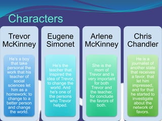 The movie follows Trevor, a third grade student who is inspired by his social studies teacher to think of an idea to change the world. Trevor comes up with the idea of a "network of favors," where people help others with small acts of kindness and pay it forward. Over time, the small acts of kindness ripple out widely. The movie shows how Trevor's idea spreads and positively impacts many lives, including helping his unemployed mother's alcoholic friend get back on his feet. However, Trevor's teacher later struggles with intimacy issues when he begins a relationship with Trevor's mother. In the end, Trevor is tragically killed when trying to help a bullied boy, but his idea lives on in inspiring others to help their community
