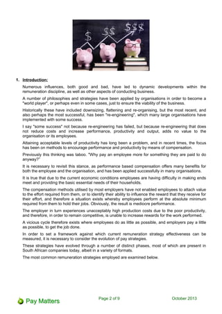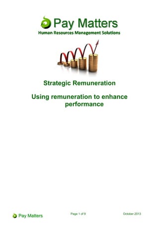 This document discusses different remuneration strategies used by organizations, including market-based remuneration and merit pay. Market-based remuneration focuses on internal parity and paying employees based on their job grade, but does not link pay to individual performance. Merit pay determines base salary based on job ranking and gives merit increases based on performance judgments, but research shows employees often do not believe their pay is truly linked to performance due to difficulties in objective measurement and potential for favoritism. Neither strategy fully achieves the goals of being perceived as fair by employees and motivating high performance.