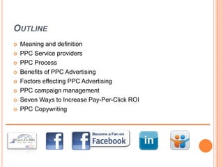 This document provides an overview of pay-per-click (PPC) advertising, including its definition, key service providers, benefits, and process. It emphasizes the importance of effective campaign management, including keyword research, ad copywriting, and tracking for better return on investment (ROI). Additionally, it offers tips for improving PPC ROI and copywriting strategies for effective advertising.