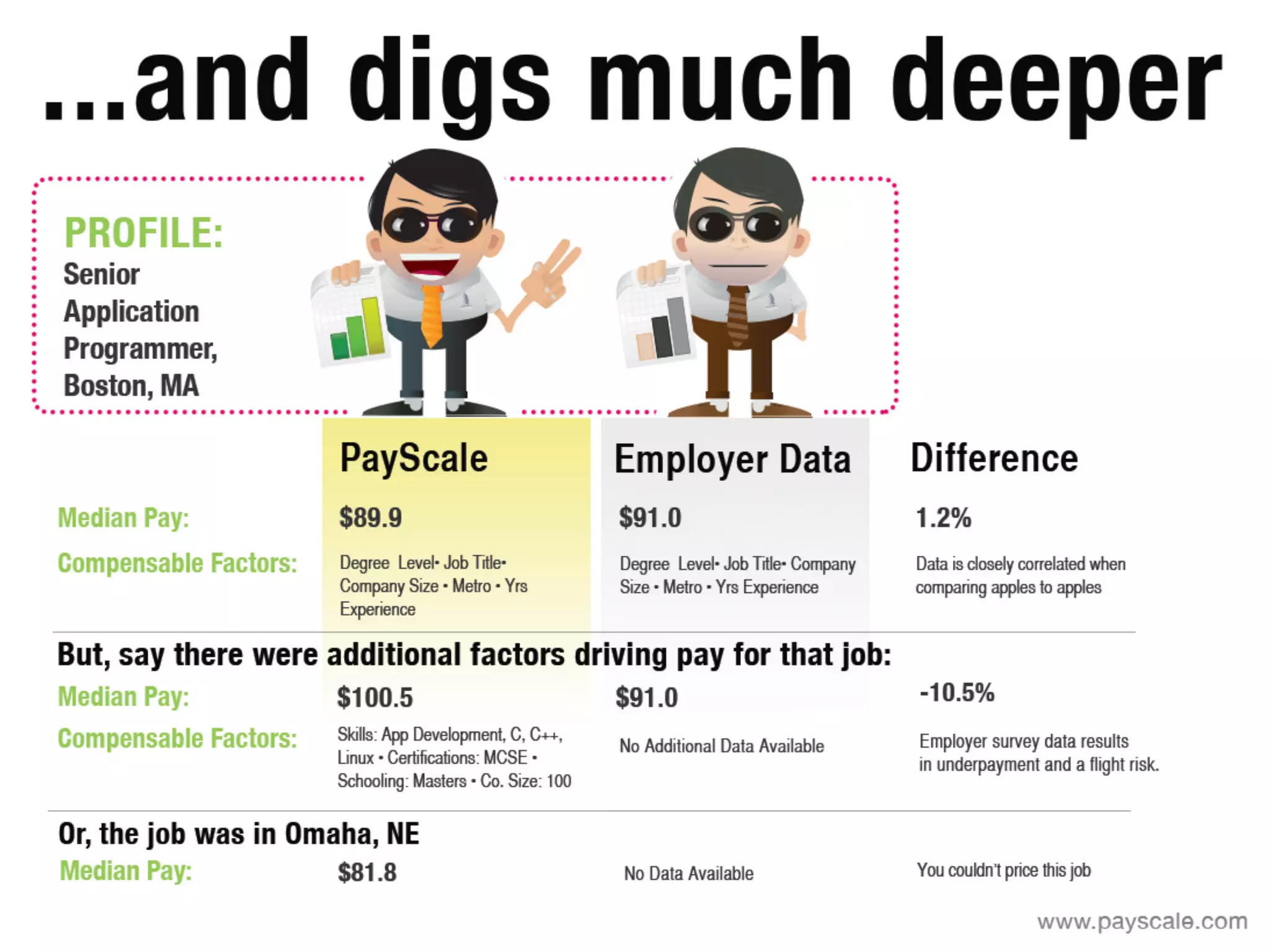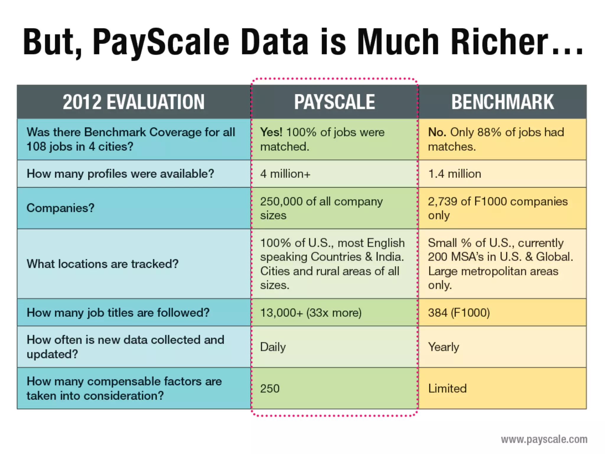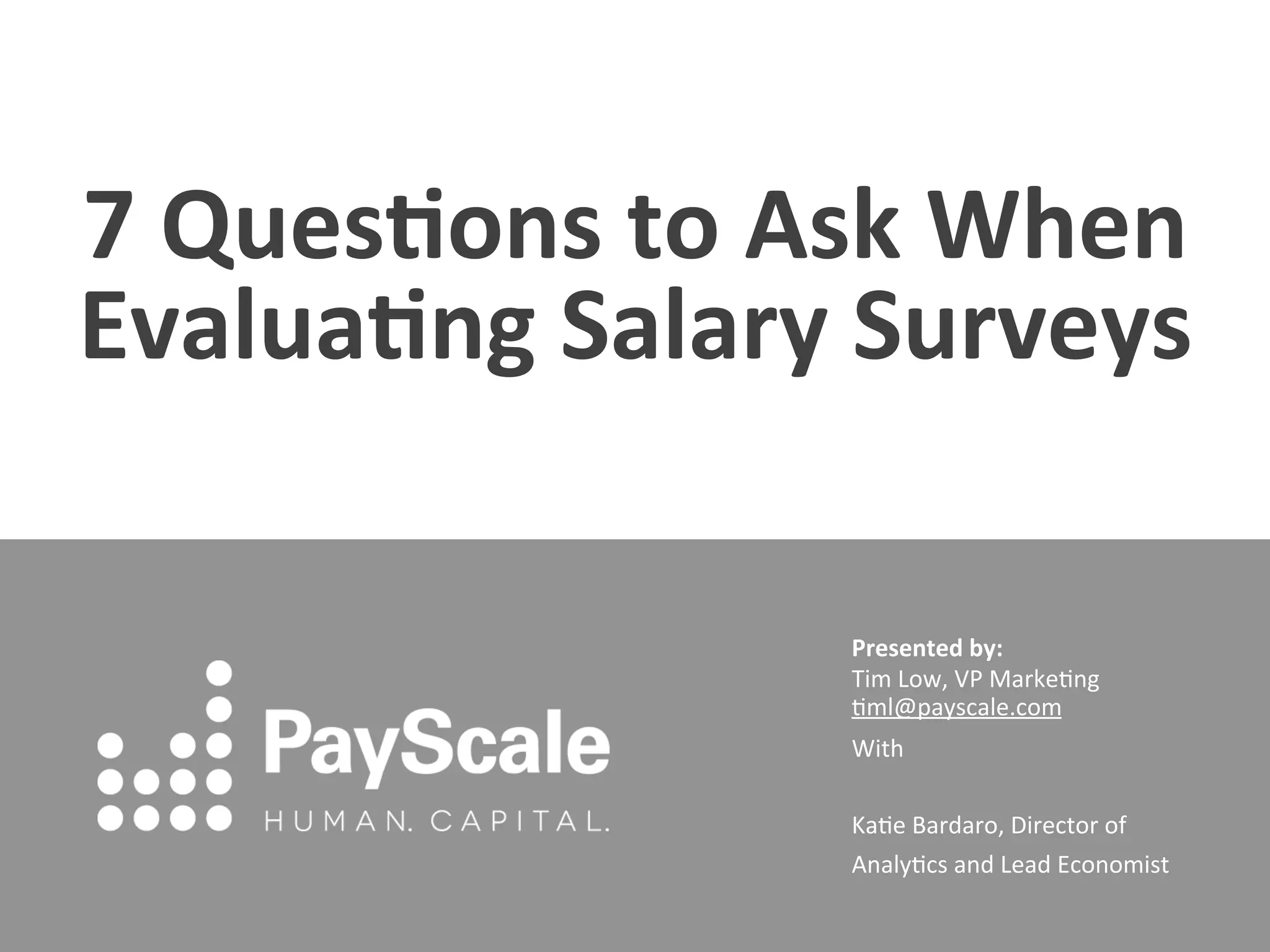 The document discusses 7 key questions to ask when evaluating salary surveys. It compares traditional annual salary surveys conducted by consultants to the crowdsourced data available from PayScale. PayScale's data is continuously collected and processed, covering unlimited locations and combinations of skills. It provides transparent details on its 250+ compensable factors and data sources to help users determine the best fit for their unique compensation needs.