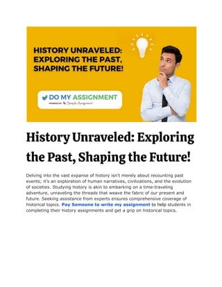 This document emphasizes the importance of studying history as a means to understand human narratives, societal evolution, and the lessons learned from past events that shape our present and future. It advocates for enhancing historical knowledge through expert assistance for assignments, highlighting critical thinking and informed decision-making as key benefits of historical study. Ultimately, it argues that a deep comprehension of history fosters cultural understanding and personal identity, guiding individuals in navigating contemporary issues.