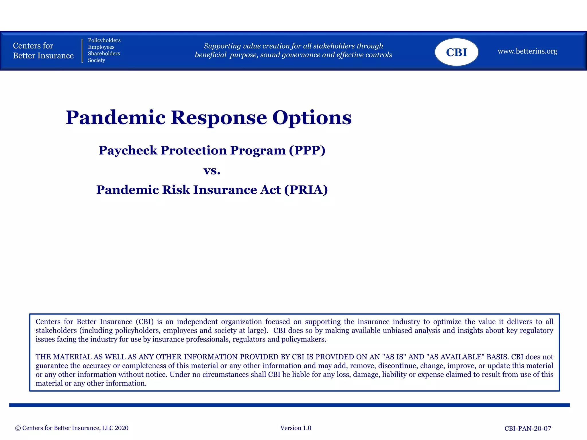 The document discusses the Centers for Better Insurance's analysis of two legislative models for managing pandemic-related economic risks: the Paycheck Protection Program (PPP) and the Pandemic Risk Insurance Act (PRIA). It highlights the advantages and disadvantages of each model, focusing on aspects such as eligibility, coverage scope, funding mechanisms, and potential impacts on businesses of varying sizes. The document emphasizes the importance of these models in preparing for future pandemic risks and their implications for policyholders and the insurance industry.