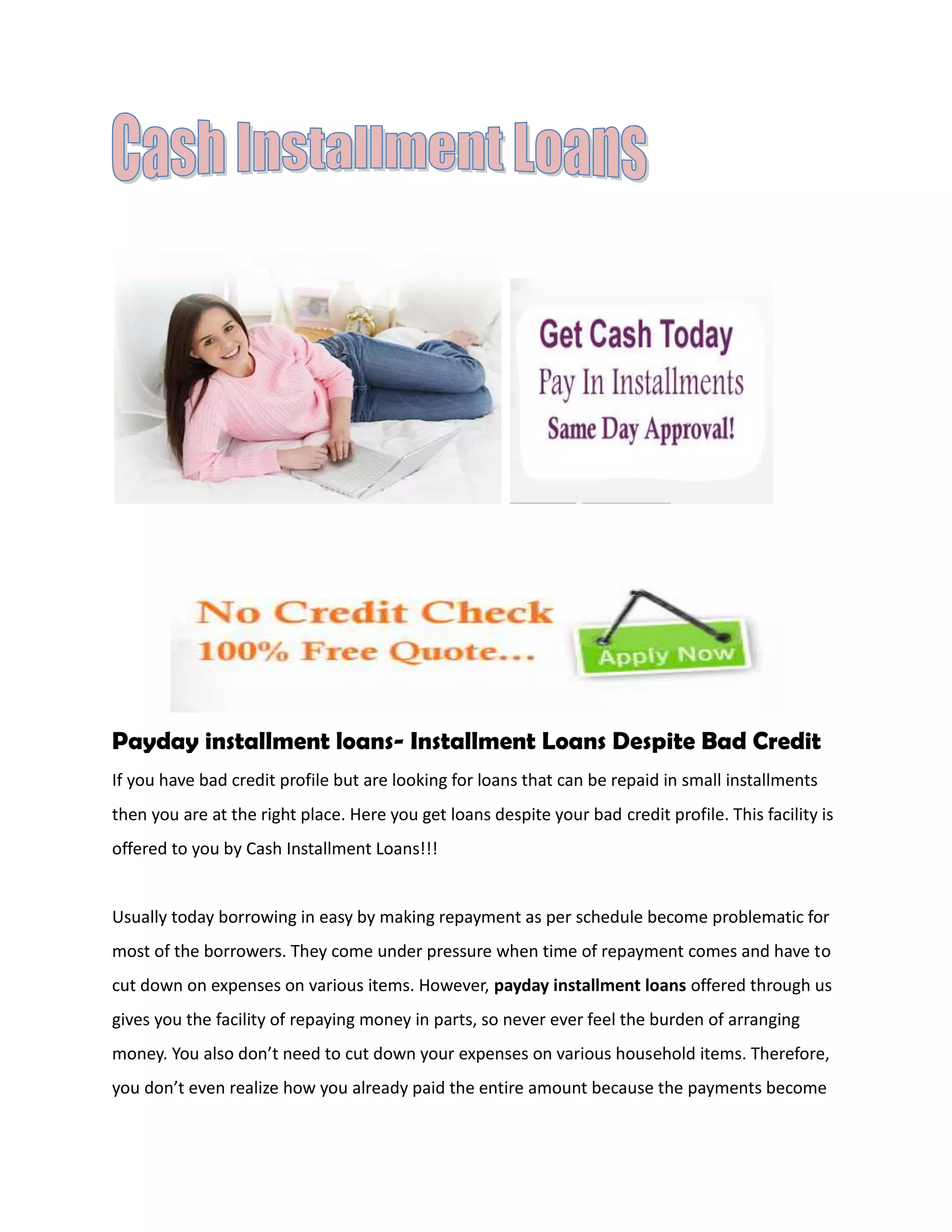 Installment loans are available for those with bad credit through Cash Installment Loans. These loans can be repaid in small installments over 14 to 30 days, making them more affordable than traditional loans. Applicants are not subject to credit checks, so a history of issues like arrears or defaults will not disqualify the application. Loan amounts range from $100 to $1500 depending on needs and repayment ability. The loans do not require collateral. Cash Installment Loans offers a way for those with bad credit to access funds through installment-based repayment.