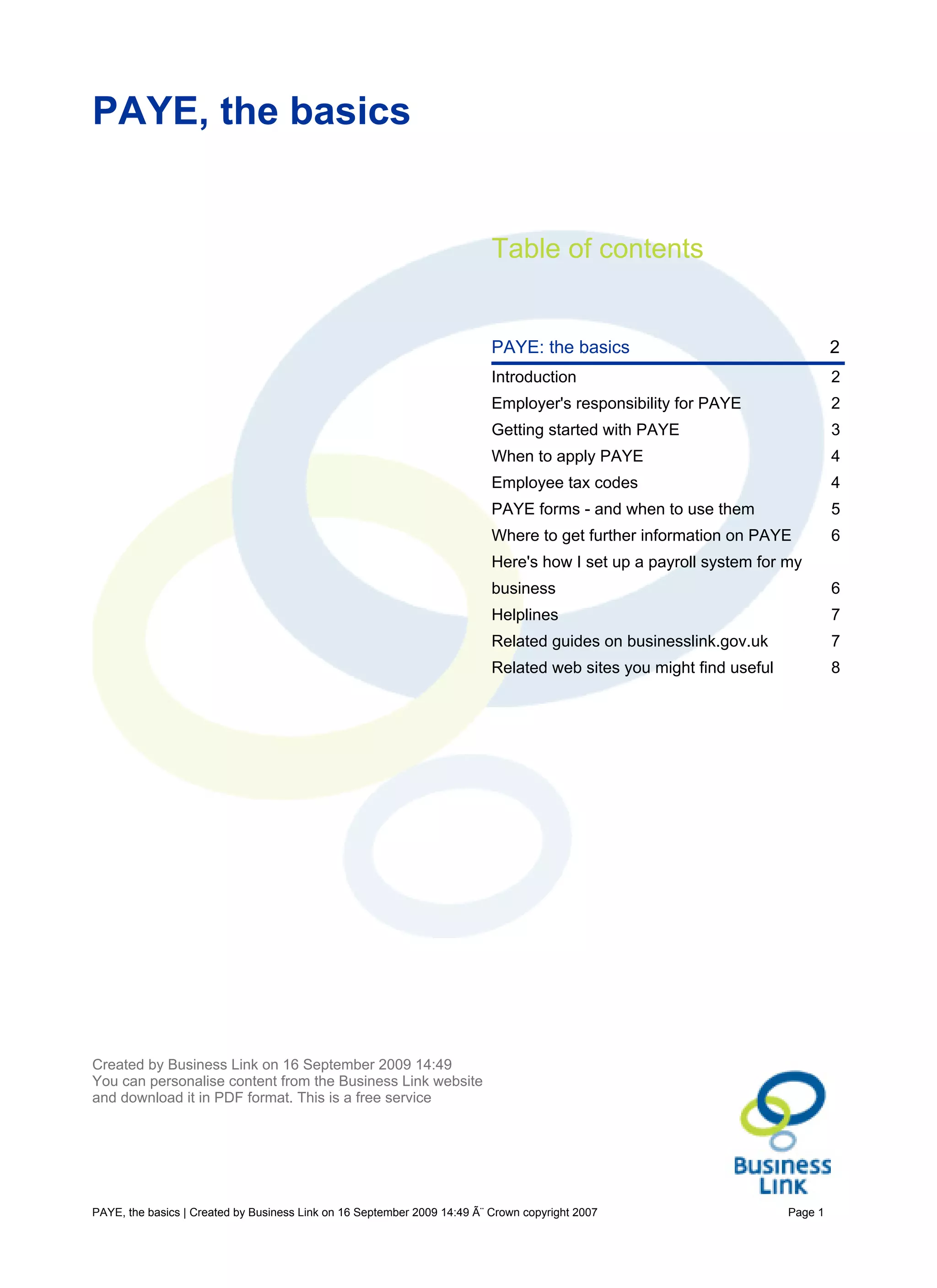 This document provides an overview of PAYE (Pay As You Earn), the UK's system for collecting income tax from employee pay. It outlines an employer's responsibilities for deducting income tax and National Insurance contributions from wages. It also describes the forms and processes involved, including how to set up a payroll system, common employee tax codes, PAYE deadlines and where to find additional guidance.