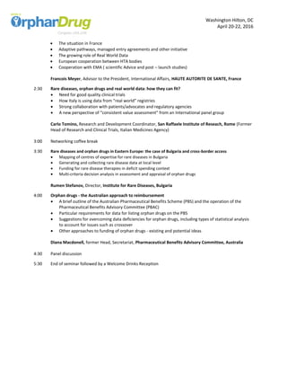 The document outlines the agenda for a pre-conference seminar on payer perspectives regarding orphan drugs to be held from April 20-22, 2016 at the Washington Hilton in DC. The seminar will include presentations from representatives of CMS, Medicaid Health Plans of America, Aetna, NICE, HAS, and research institutions on national and international orphan drug coverage policies, challenges assessing orphan drugs, and approaches to funding and reimbursement. Panel discussions will address US and European payer perspectives, the use of real-world data for orphan drugs, rare diseases in Eastern Europe, and Australia's approach to orphan drug reimbursement through the Pharmaceutical Benefits Scheme. The seminar aims to provide insights into payer requirements and processes