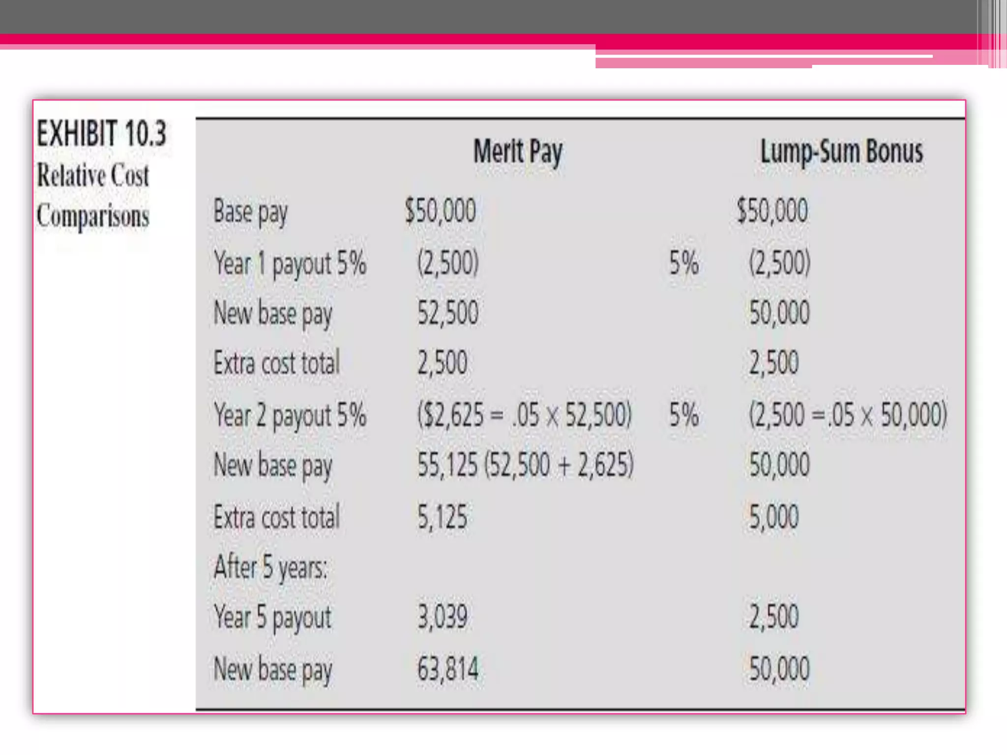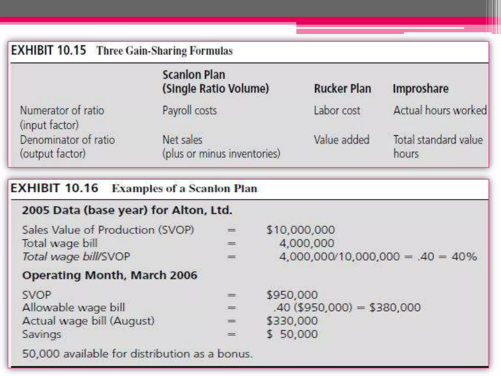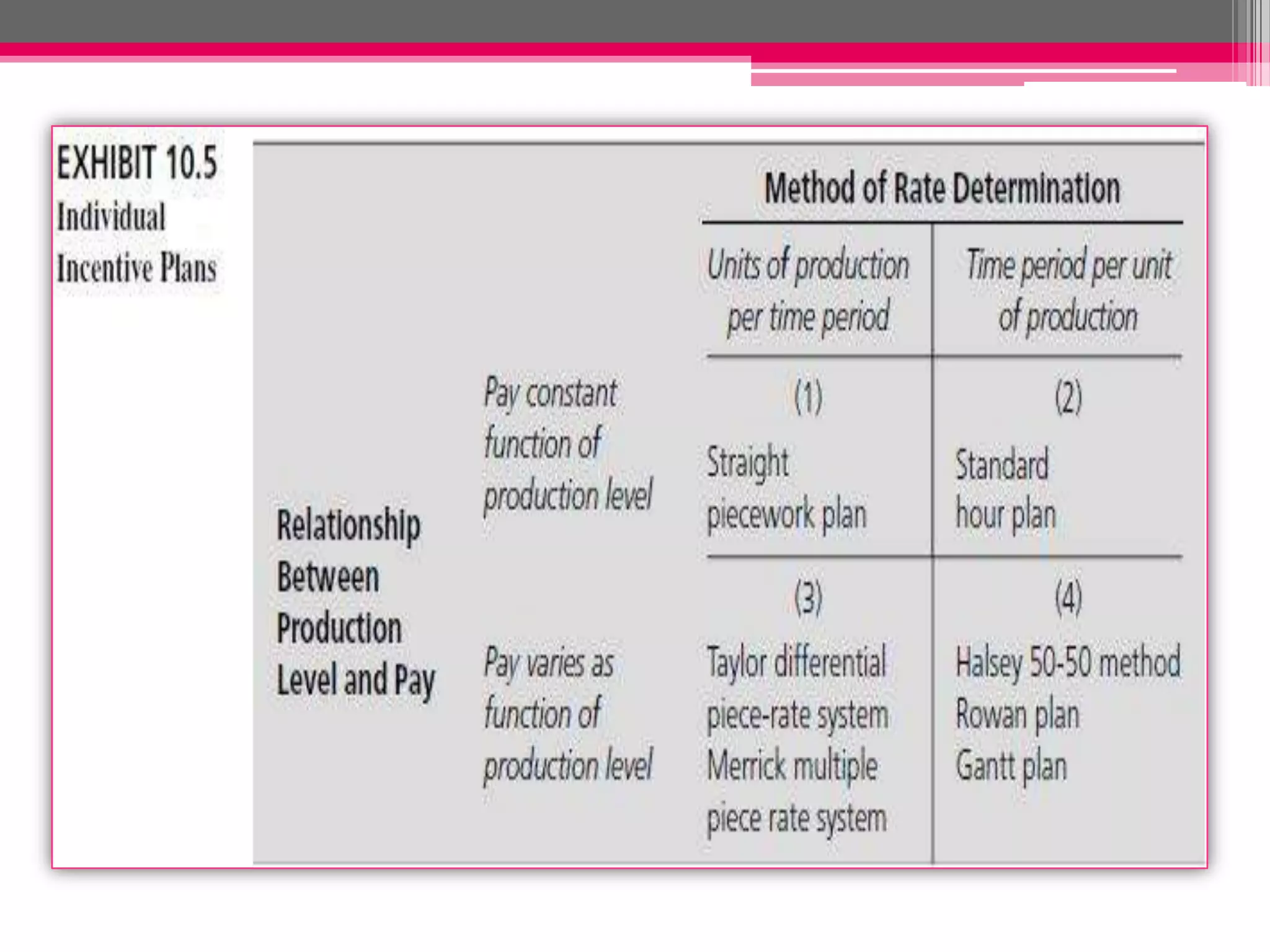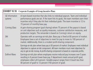 This document discusses different types of variable pay plans including individual incentive plans and group incentive plans. It provides details on merit pay, lump-sum bonuses, individual spot awards, and examples of individual incentive plans like piecework systems. It also discusses large group incentive plans including gain-sharing plans and profit-sharing plans as well as advantages and disadvantages of group incentive plans. The document provides examples of various pay for performance plans companies can implement.