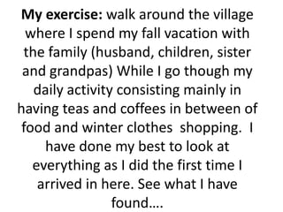 The document provides observations from a walk around a village in northern Spain during fall. It describes the traditional shops, cafes, market, and sense of community. Key points noted include the focus on quality products and excellent customer service at family-run businesses, the weekly market featuring local foods, and signs of traditional celebrations for Todos Los Santos rather than Halloween.