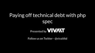 This document discusses using PHPSpec to help manage technical debt in PHP code. It explains that technical debt occurs when code complexity increases without refactoring. PHPSpec can help pay off technical debt through specifying behavior examples to guide refactoring. It provides examples of writing PHPSpec specifications that describe class behavior and interactions with other objects. The document argues that specifying code behavior through PHPSpec enables technical debt to be managed and code redesigned with confidence.