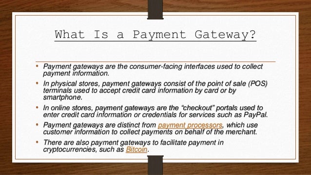 Payment gateways are interfaces that allow merchants to accept electronic payments from customers. They connect online stores and point-of-sale terminals to payment processors, who transfer funds from customers' bank accounts or credit cards to merchants' bank accounts. Payment gateways come in different types depending on their technical requirements and may charge merchants various fees for their services. They enable secure transactions between customers and merchants in both online and physical stores.
