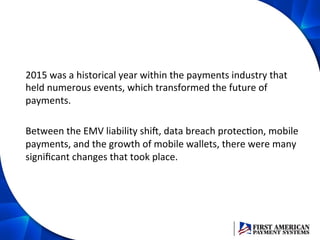 The payments industry in 2016 is set to be shaped by significant trends including the continuation of EMV implementation, the rise of mobile wallets, and the growth of NFC technology. With EMV technology becoming essential for preventing credit card fraud, many merchants are still not compliant, while mobile payment transactions are projected to surge by 210%. Additionally, blockchain technology is anticipated to emerge as a transformative force in payments, promising faster and more cost-effective transaction processing.