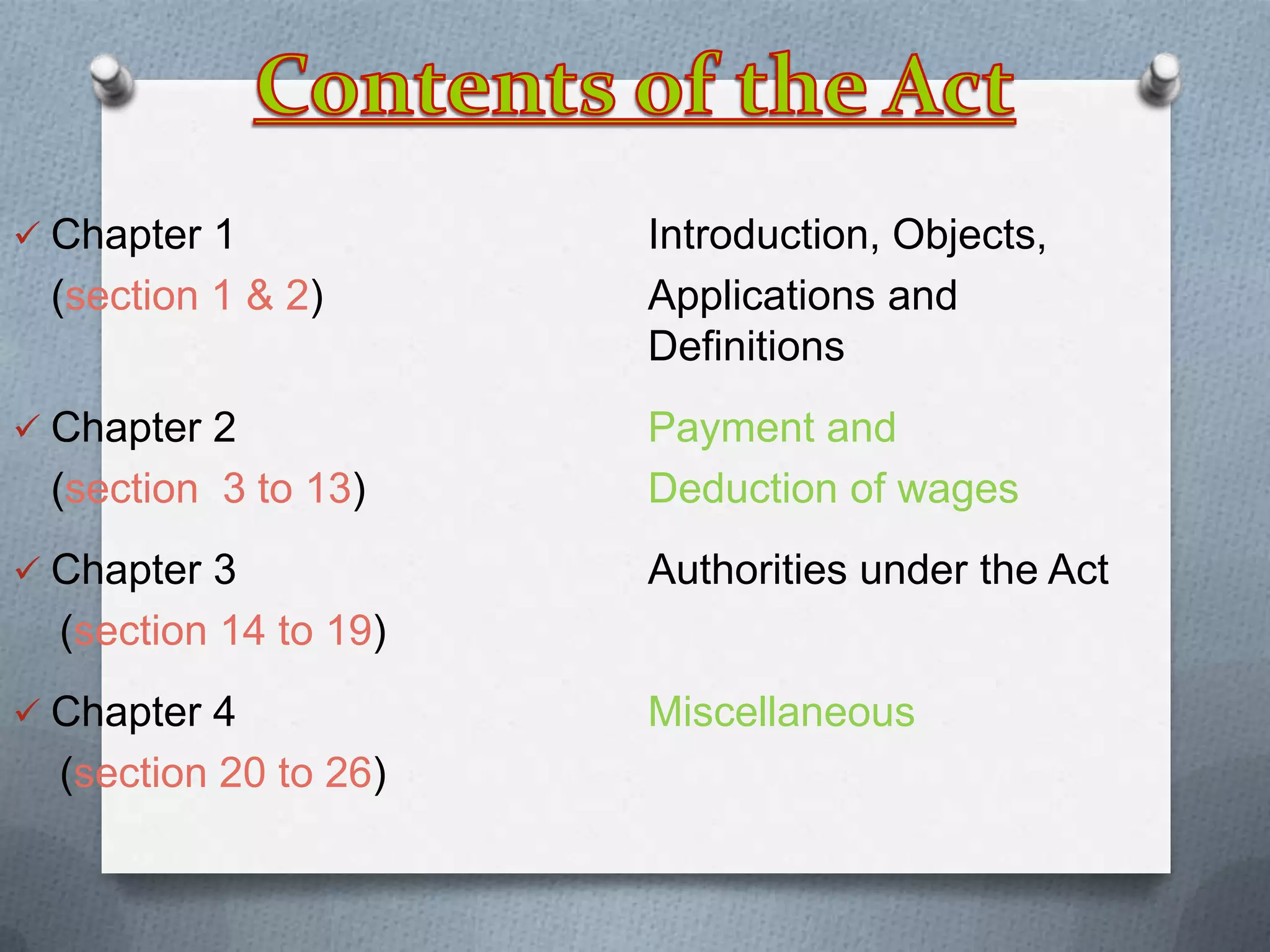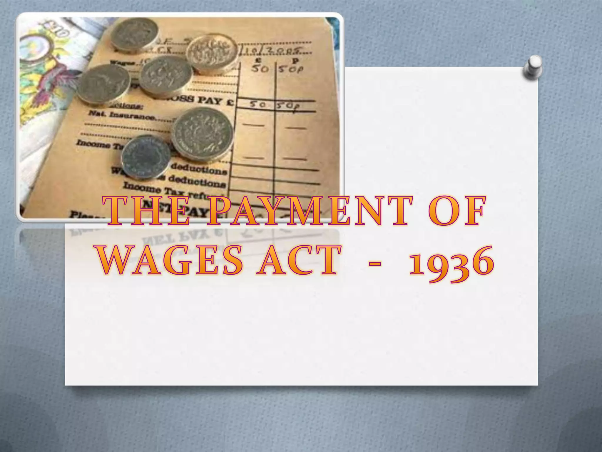 This document summarizes key sections of the Payment of Wages Act of 1936 in India. It outlines definitions of employed persons, employers, and wages. It discusses employer responsibilities to pay wages on time, fix wage periods, allowances for deductions, and restrictions on fines and deductions from wages. Authorities like Inspectors are authorized to enforce the Act. The document also states that any contracts violating employees' rights under this Act will be considered null and void.