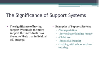 Support systems are external resources like friends and family that provide assistance lacking otherwise. Support systems play a vital role in an individual's success by providing transportation, childcare, financial support, emotional support, and academic assistance. The document describes the author's strong support system of grandparents who helped care for them after school, provided transportation, ensured meals and educational needs were met, and created a stable home environment during parental divorce, leading the author to become a successful adult.