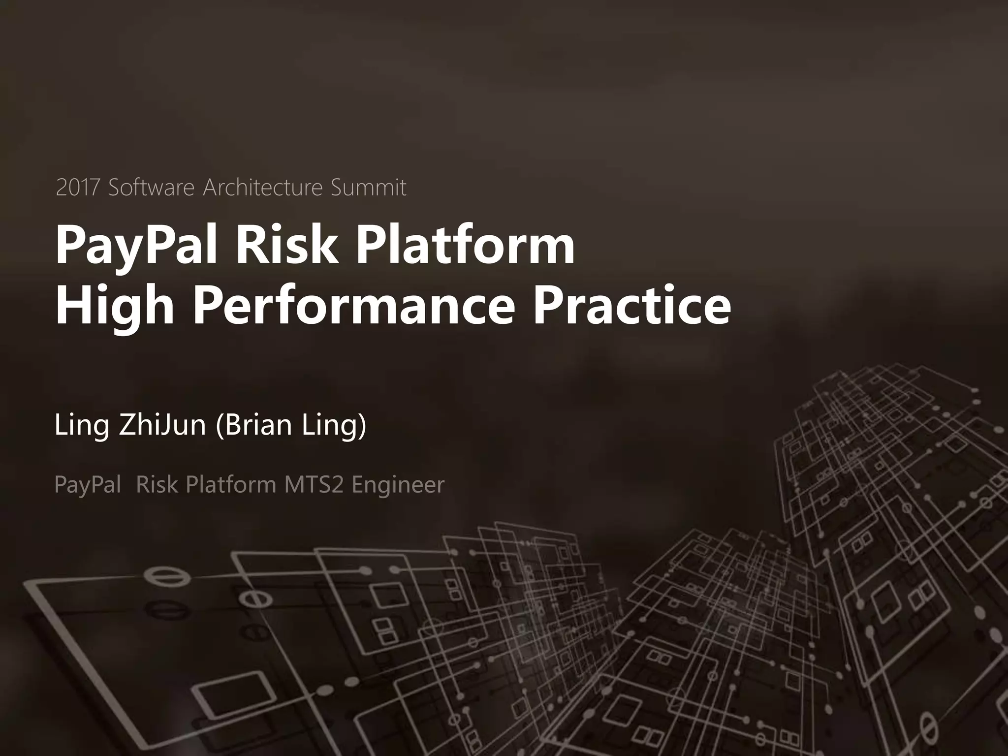 This document summarizes PayPal's risk platform architecture. It discusses how PayPal processes over 1 billion payments per year using an asynchronous architecture for its risk data access layer (DAL) service. The async solution improved latency, throughput, CPU and memory usage compared to the synchronous approach. Future plans include further optimizing the async DAL service, RPC, and in-memory data access. The goal is to process payments at tremendous scale with low latency and system load through an event-driven and highly reusable architecture.