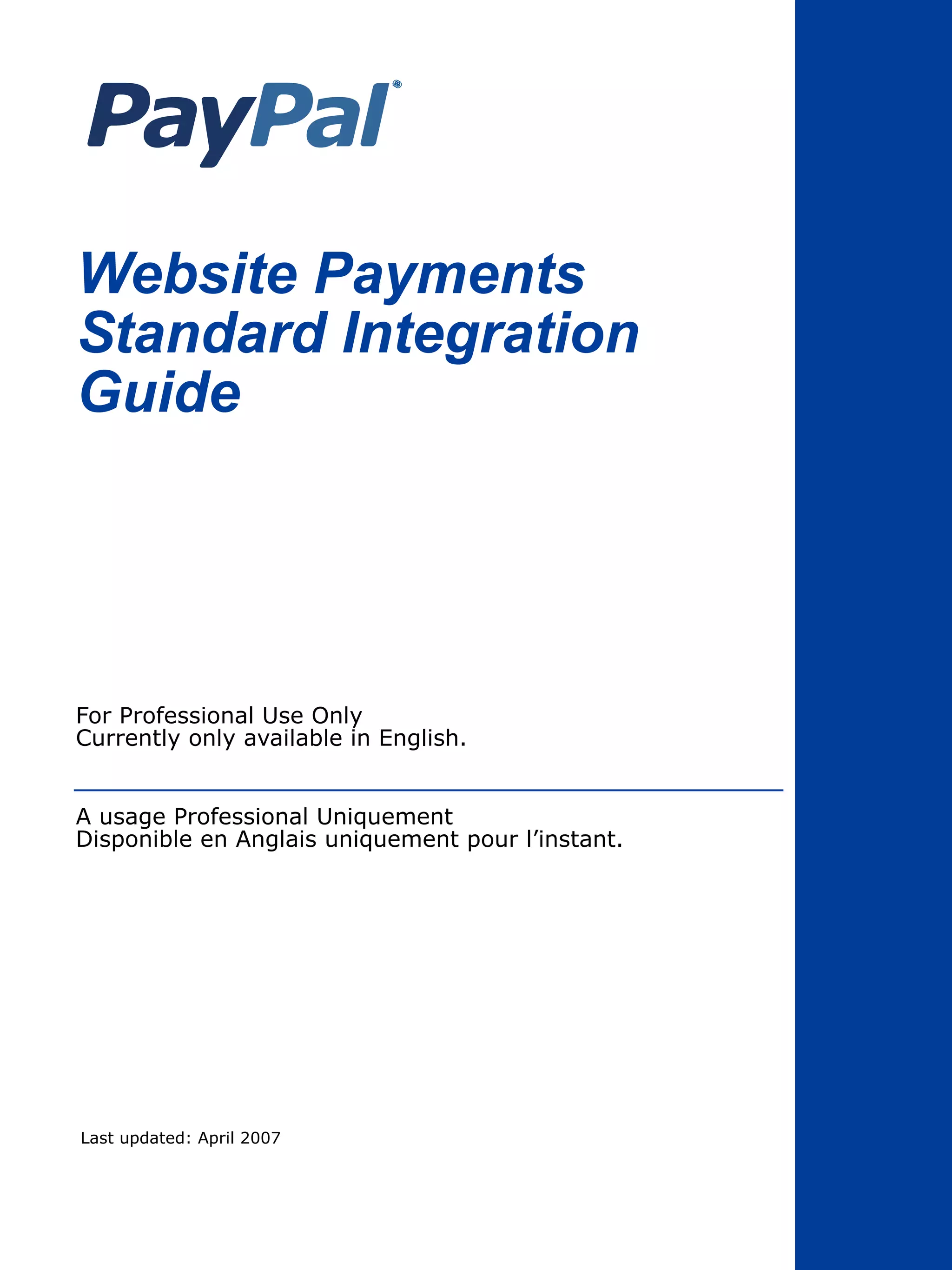The document is the PayPal Website Payments Standard Integration Guide from April 2007, intended for professional use and currently only available in English. It provides comprehensive instructions on integrating PayPal's payment services, detailing functionalities like transaction notifications, account management, and handling various payment types. Additionally, it includes disclaimers about the use of the information, indicating that PayPal does not guarantee the availability of features in the future.