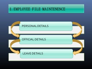 This document outlines the components and processes of a payroll system. It discusses inputs like employee data, deductions, and outputs like payroll registers and payslips. It describes processing payroll, maintaining employee files that include personal details and leave balances. Various reports produced by the system are also detailed like cancelling records of retired employees. The conclusion states that payroll systems manage all compensation paid to employees and help organizations analyze employee information and benefits.