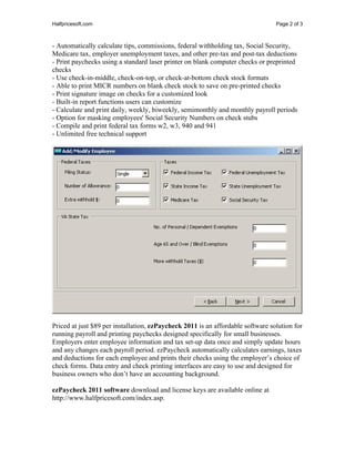 Halfpricesoft.com has released the 2011 edition of ezpaycheck payroll software, tailored for small businesses and non-profits, featuring new tax reporting and deduction functionalities. The software offers a free 30-day trial without the need for data entry and includes comprehensive updates like current tax tables and customizable reporting. Priced at $89 per installation, ezpaycheck 2011 simplifies payroll processes for businesses lacking accounting expertise.