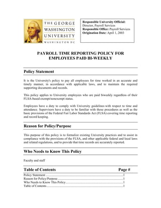 This document outlines George Washington University's policy for payroll time reporting for employees paid bi-weekly. It states that all employees must accurately report their time worked using the University's Time Reporting System in order to ensure compliant and timely pay. Nonexempt employees must record their daily arrivals and departures while exempt employees are ordinarily paid for 80 hours per pay period. Supervisors are responsible for reviewing and approving employee time reports. The policy aims to comply with federal labor laws while accurately documenting hours worked.