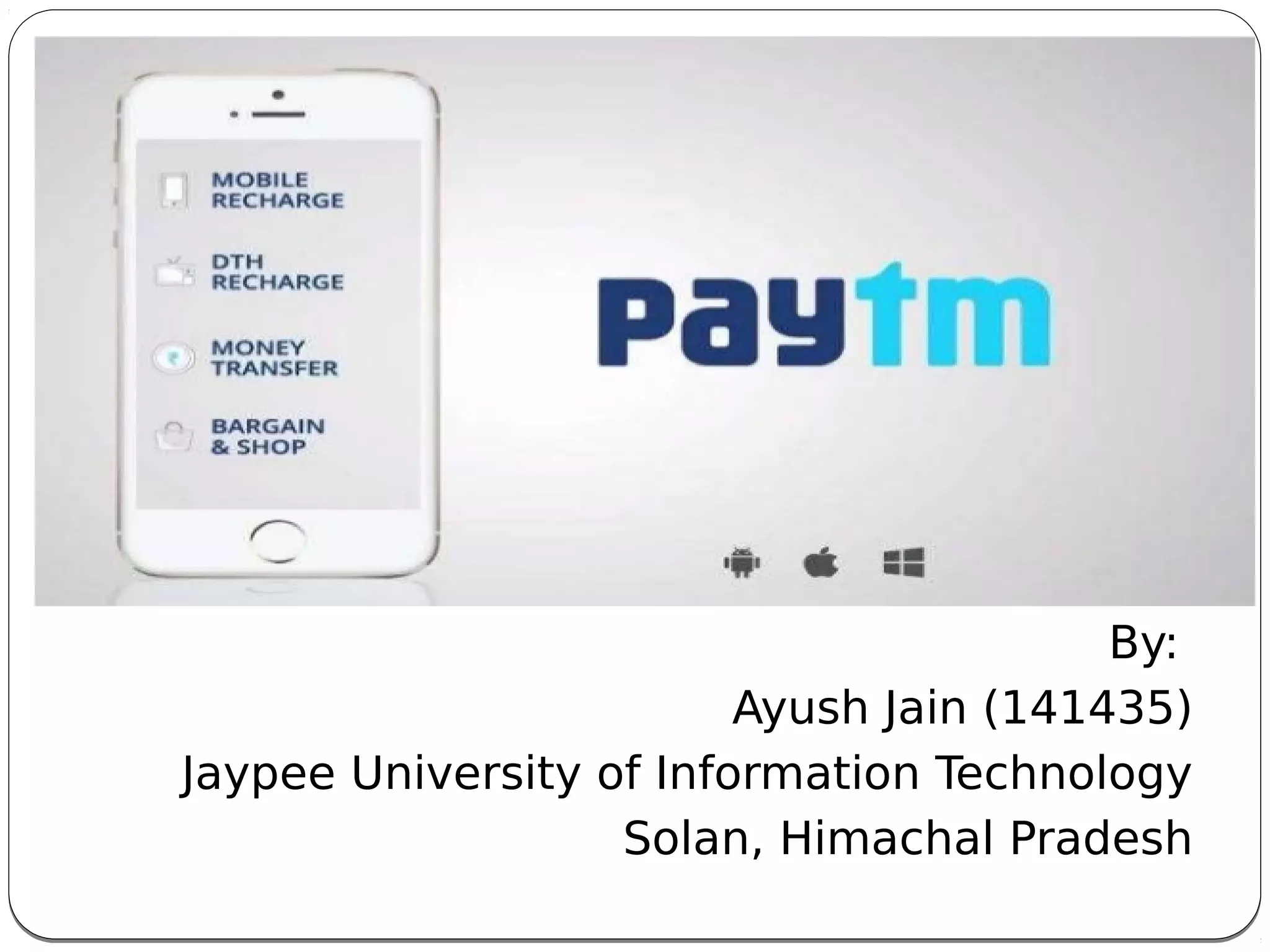Paytm is India's largest mobile payments and commerce platform founded in 2010. It initially offered mobile recharging and bill payment services but has since expanded into travel, ticketing, shopping, and peer-to-peer payments. After demonetization in India in 2016, Paytm saw a huge surge in users and transactions as it promoted cashless payments. It now has over 500 million users and competes with other digital wallets in India.