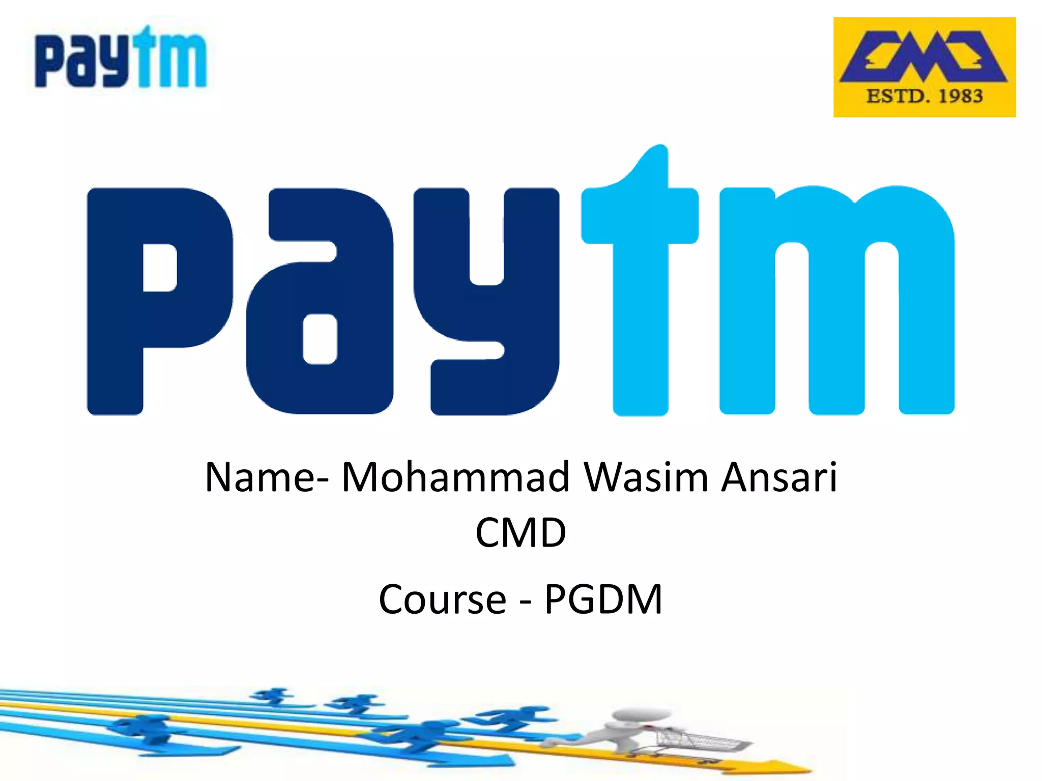 Mohammad Wasim Ansari is pursuing a PGDM and his sector is E-Commerce. The document discusses the history and growth of e-commerce in India, highlighting key players like Paytm, Flipkart, Snapdeal and Amazon. It analyzes Paytm through a SWOT analysis, discussing its strengths in brand awareness, scaling after demonetization, and investments. The future of e-commerce in India is predicted to experience exponential growth between now and 2020, especially in rural areas and among women shoppers.