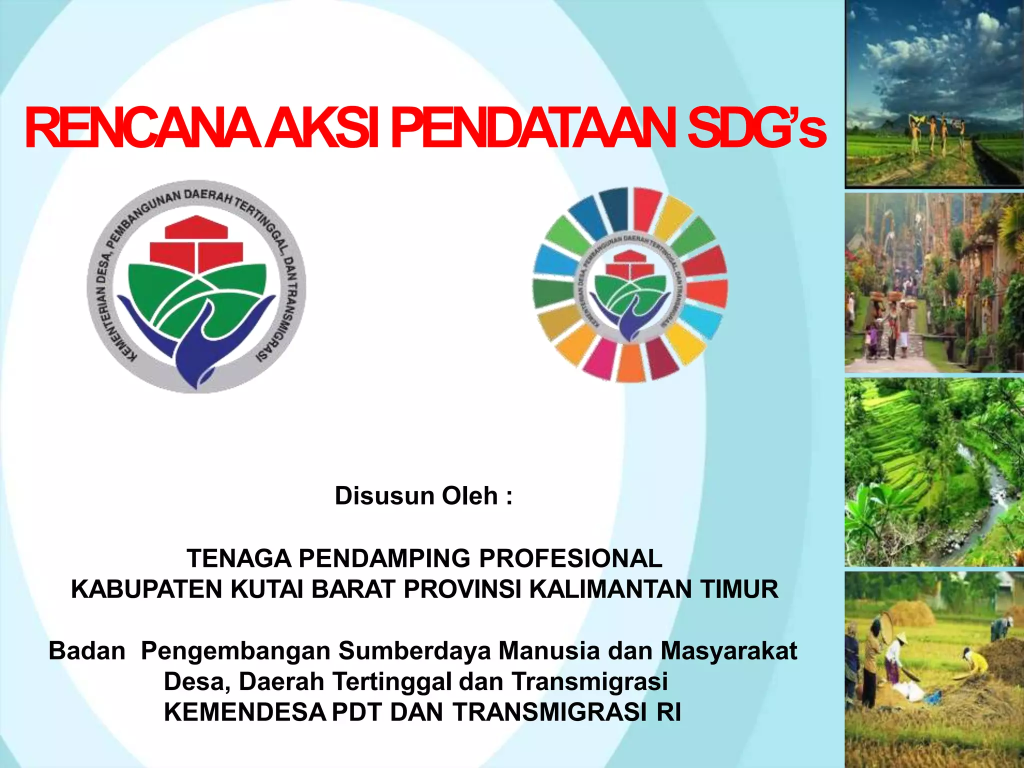 Rencana ini membahas pendataan SDG's Desa di tingkat desa untuk memperbarui data. Terdapat 8 kegiatan utama yang meliputi sosialisasi, pembentukan tim relawan, pelatihan, pelaksanaan pendataan data desa, rukun tetangga, keluarga dan individu menggunakan aplikasi, pelaporan hasil, monitoring, dan penetapan data oleh Kepala Desa.