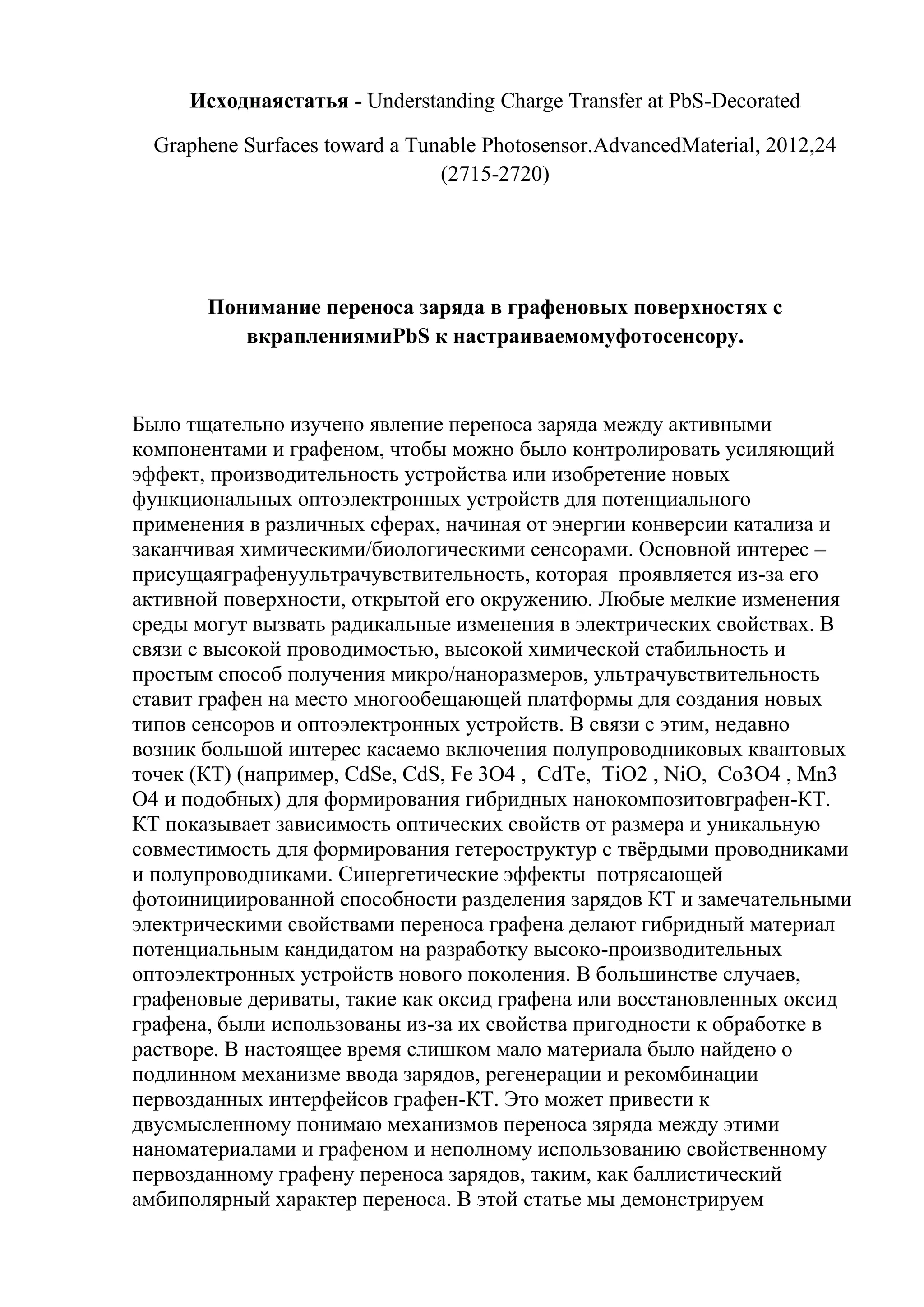 Статья исследует механизм переноса заряда между квантовыми точками PbS и графеном для создания настраиваемых фотосенсоров. Открываются новые возможности для применения графеновых гибридных устройств благодаря их ультрачувствительности и высокой проводимости, а также способности к фотоинициированному переносу заряда. Результаты показывают, что оптимальная толщина пленки PbS составляет 2 нм для максимизации фоточувствительных свойств.
