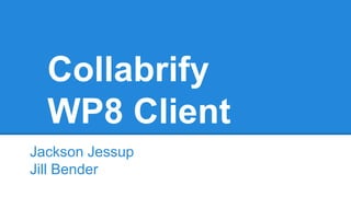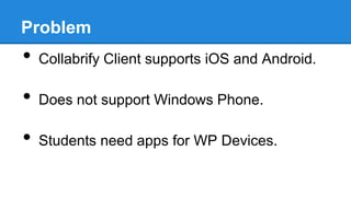 The document discusses developing a Collabrify client for Windows Phone 8 (WP8). It would allow Collabrify's collaborative features to be used in WP8 apps, as Collabrify currently only supports iOS and Android. The solution is to design a Collabrify WP8 client using Google Protocol Buffers for communication with Collabrify's existing cloud backend. This would enable WP8 apps like WeKWL, WeMap, and WeDraw to leverage Collabrify's real-time collaboration.