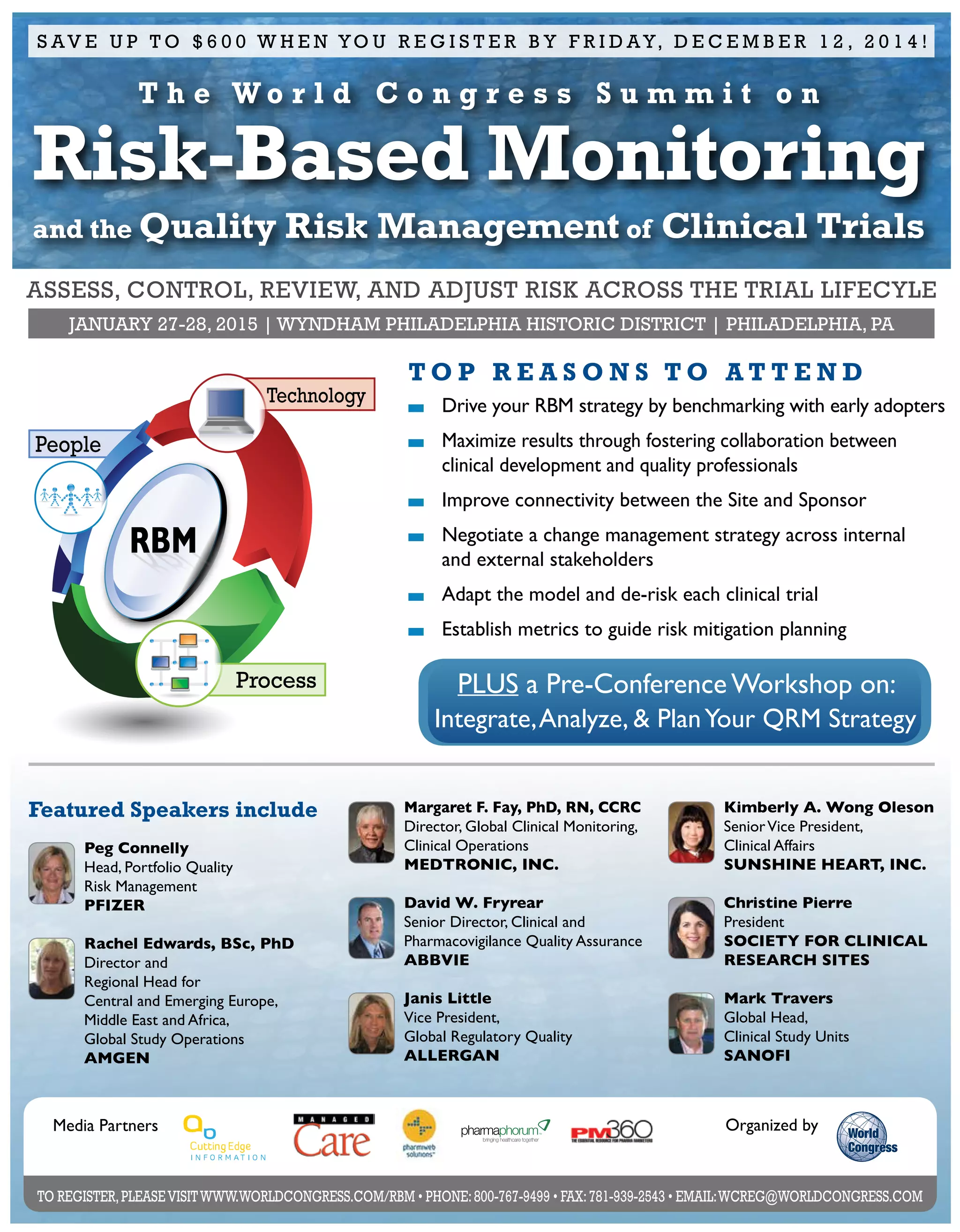 The World Congress Summit on Risk-Based Monitoring and Quality Risk Management for Clinical Trials will take place from January 27-28, 2015, in Philadelphia, offering insights into improving clinical trial processes through risk management strategies. Attendees, including pharmaceutical and medical device industry professionals, will engage with expert speakers on topics like risk assessment integration, metrics for risk-based monitoring, and strategies for collaboration between sites and sponsors. Early registration discounts are available, and the summit features workshops, case studies, and networking opportunities.