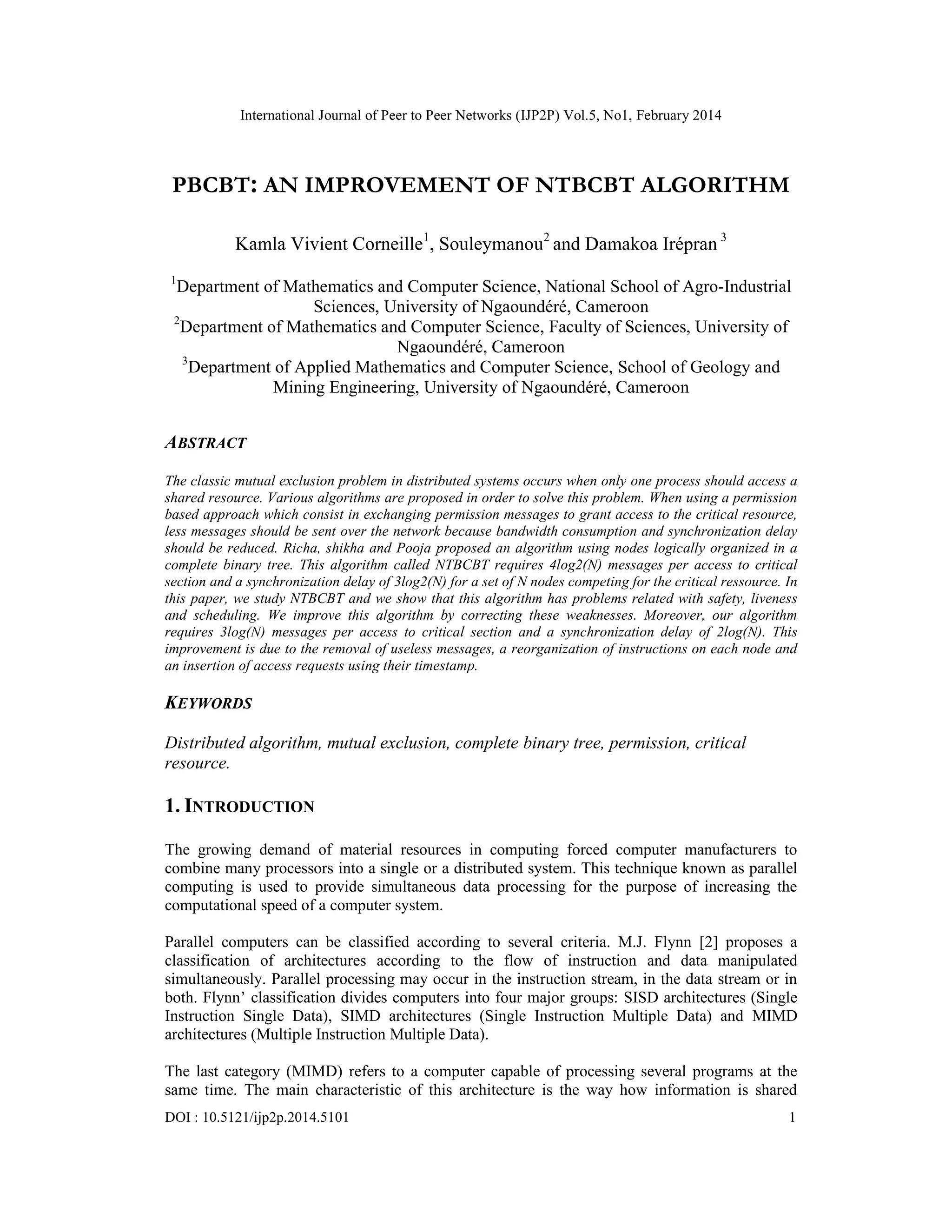 This paper summarizes and improves upon the NTBCBT mutual exclusion algorithm. The NTBCBT algorithm has problems related to safety, liveness, and scheduling when nodes request access to a critical resource. The paper proposes an improved algorithm called PBCBT that addresses these weaknesses. PBCBT requires only 3log(N) messages per access to the critical section, compared to 4log(N) for NTBCBT. It also has an improved synchronization delay of 2log(N) messages compared to 3log(N) for NTBCBT. The improvements are achieved through removing unnecessary messages, reorganizing node instructions, and prioritizing requests based on timestamps.
