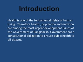 The document discusses important health sector programs in Bangladesh, including health, population, and nutrition. It defines a sector as activities within defined institutional and budgetary frameworks governed by government policy. The key health sector programs are maternal and child health, non-communicable and climate-related diseases, community clinics, population control and family planning, and national nutrition services and food safety. The Ministry of Health and Family Welfare coordinates health services across government and private providers.