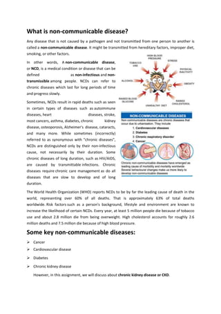 This document discusses chronic kidney disease (CKD). It defines CKD as a progressive loss of renal function over months or years that is identified by increased creatinine levels and protein or blood in the urine. The two main causes of CKD are diabetes and high blood pressure, which together account for two-thirds of cases. Symptoms of CKD may not appear until later stages and include fatigue, poor appetite, and swollen limbs. Anyone can develop CKD, but those with diabetes, high blood pressure, family history, older age, or certain ethnicities are at higher risk. CKD is diagnosed through tests of kidney function and imaging and staged based on glomerular filtration rate.