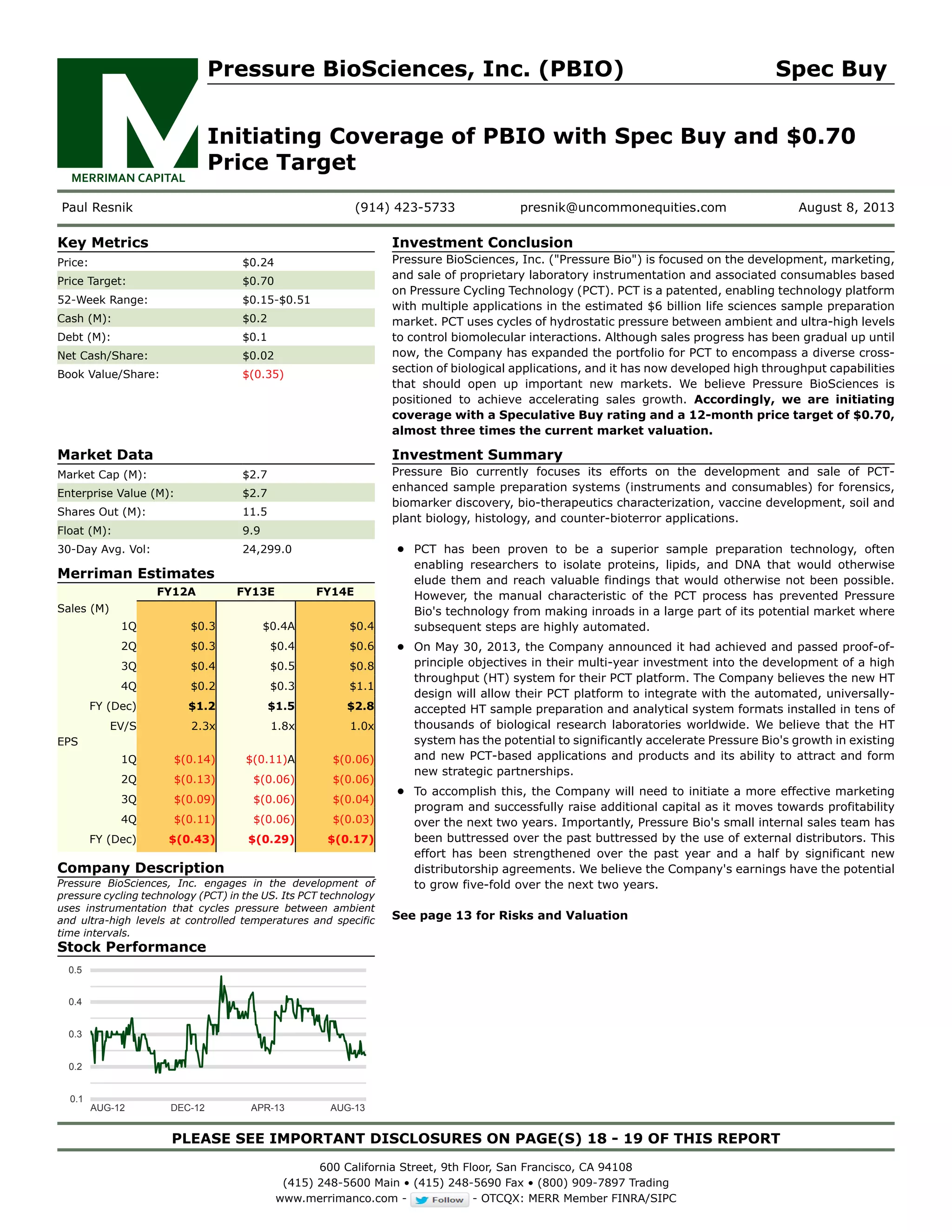 - Pressure BioSciences is initiating coverage of Pressure BioSciences (PBIO) stock with a Speculative Buy rating and $0.70 price target, almost triple the current market valuation.