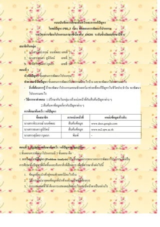 โจทย์ปัญหา PBL 3 เรื่อง ขั้นตอนการพัฒนาโปรแกรม รายวิชาการเขียนโปรแกรมภาษาซีเบื้องต้น ง30201 ระดับชั้นมัธยมศึกษาปีที่ 4 สมาชิกในกลุ่ม 1. นางสาวจิระภรณ์ นนท์พละ เลขที่ 21 2. นางสาวธนยา คูนีรัตน์ เลขที่ 23 3. นางสาวสุมิตรา บุษบา เลขที่ 24 ตอนที่ 1 หัวข้อปัญหา ขั้นตอนการพัฒนาโปรแกรม ทาความเข้าใจปัญหา ขั้นตอนการพัฒนาโปรแกรมมีอะไรบ้าง และจะพัฒนาโปรแกรมอะไร - สิ่งที่ต้องการรู้ ถ้าจะพัฒนาโปรแกรมคอมพิวเตอร์มาช่วยเพื่อแก้ปัญหาในชีวิตประจาวัน จะพัฒนา โปรแกรมอะไร - วิธีการหาคาตอบ 1.ปรึกษากันในกลุ่ม แล้วแบ่งหน้าที่กันสืบค้นปัญหาต่าง ๆ 2.สืบค้นหาข้อมูลเกี่ยวกับปัญหาต่าง ๆ การศึกษาค้นคว้า / แก้ปัญหา ชื่อสมาชิก การแบ่งหน้าที่ แหล่งข้อมูล/อ้างอิง นางสาวจิระภรณ์ นนท์พละ สืบค้นข้อมูล www.docs.google.com นางสาวธนยา คูนีรัตน์ สืบค้นข้อมูล www.ns2.spw.ac.th นางสาวสุมิตรา บุษบา พิมพ์ - ตอนที่ 2 สรุปผลการศึกษาค้นคว้า / แก้ปัญหาตามภารกิจ 1.ขั้นตอนการพัฒนาโปรแกรมมี 5 ขั้นตอน คือ 1. การวิเคราะห์ปัญหา (Problem Analysis) เป็นขั้นตอนแรกของวงจรการพัฒนาโปรแกรม ซึ่งเป็น การศึกษาถึงปัญหาที่เกิดขึ้นและค้นหาสิ่งที่ต้องการ เพื่อพิจารณาสิ่งต่อไปนี้ 1. ข้อมูลที่จะนาเข้าสู่คอมพิวเตอร์มีอะไรบ้าง 2. วิธีการประมวลผลข้อมูลที่นาเข้าและผลลัพธ์ที่ต้องการ 3. การแสดงผลที่ได้ ต้องการแสดงผลลัพธ์อะไรและมีหน้าตาเป็นอย่างไร