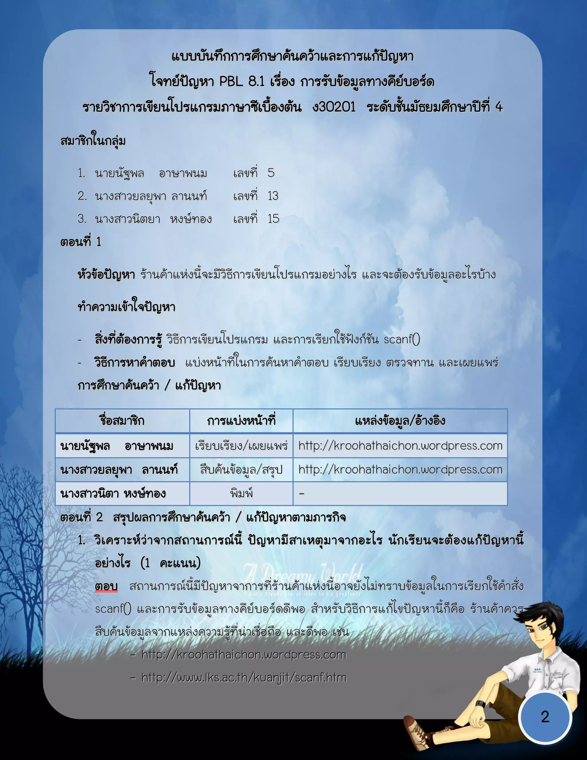ั โจทย์ปญหา PBL 8.1 เรือง การรับข้อมูลทางคียบอร์ด ั ่ ์ รายวิชาการเขียนโปรแกรมภาษาซีเบืองต้น ง30201 ระดับชันมัธยมศึกษาปีที่ 4 ้ ้ สมาชิกในกลุ่ม 1. นายนัฐพล อาษาพนม เลขที่ 5 2. นางสาวยลยุพา ลานนท์ เลขที่ 13 3. นางสาวนิตยา หงษ์ทอง เลขที่ 15 ตอนที่ 1 หัวข้อปัญหา ร้านค้าแห่งนี้จะมีวิธีการเขียนโปรแกรมอย่างไร และจะต้องรับข้อมูลอะไรบ้าง ทาความเข้าใจปัญหา - สิ่งที่ต้องการรู้ วิธีการเขียนโปรแกรม และการเรียกใช้ฟังก์ชัน scanf() - วิธีการหาคาตอบ แบ่งหน้าที่ในการค้นหาคาตอบ เรียบเรียง ตรวจทาน และเผยแพร่ การศึกษาค้นคว้า / แก้ปัญหา ชื่อสมาชิก การแบ่งหน้าที่ แหล่งข้อมูล/อ้างอิง นายนัฐพล อาษาพนม เรียบเรียง/เผยแพร่ http://kroohathaichon.wordpress.com นางสาวยลยุพา ลานนท์ สืบค้นข้อมูล/สรุป http://kroohathaichon.wordpress.com นางสาวนิตา หงษ์ทอง พิมพ์ - ตอนที่ 2 สรุปผลการศึกษาค้นคว้า / แก้ปัญหาตามภารกิจ 1. วิเ คราะห์ว่า จากสถานการณ์นี้ ปัญ หามีส าเหตุม าจากอะไร นั กเรีย นจะต้ อ งแก้ ปัญ หานี้ อย่างไร (1 คะแนน) ตอบ สถานการณ์นี้มีปัญหาจาการที่ร้านค้าแห่งนี้อาจยังไม่ทราบข้อมูลในการเรียกใช้คาสั่ง scanf() และการรับข้อมูลทางคีย์บอร์ดดีพอ สาหรับวิธีการแก้ไขปัญหานี้ก็คือ ร้านค้าควร สืบค้นข้อมูลจากแหล่งความรู้ที่น่าเชื่อถือ และดีพอ เช่น - http://kroohathaichon.wordpress.com - http://www.lks.ac.th/kuanjit/scanf.htm 2