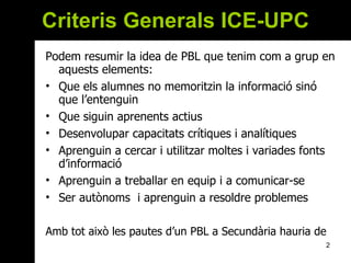 Criteris Generals ICE-UPCPodem resumir la idea de PBL que tenim com a grup en aquests elements: Que els alumnes no memoritzin la informació sinó que l’entenguin Que siguin aprenents actius Desenvolupar capacitats crítiques i analítiques Aprenguin a cercar i utilitzar moltes i variades fonts d’informació Aprenguin a treballar en equip i a comunicar-se Ser autònoms i aprenguin a resoldre problemes Amb tot això les pautes d’un PBL a Secundària hauria de