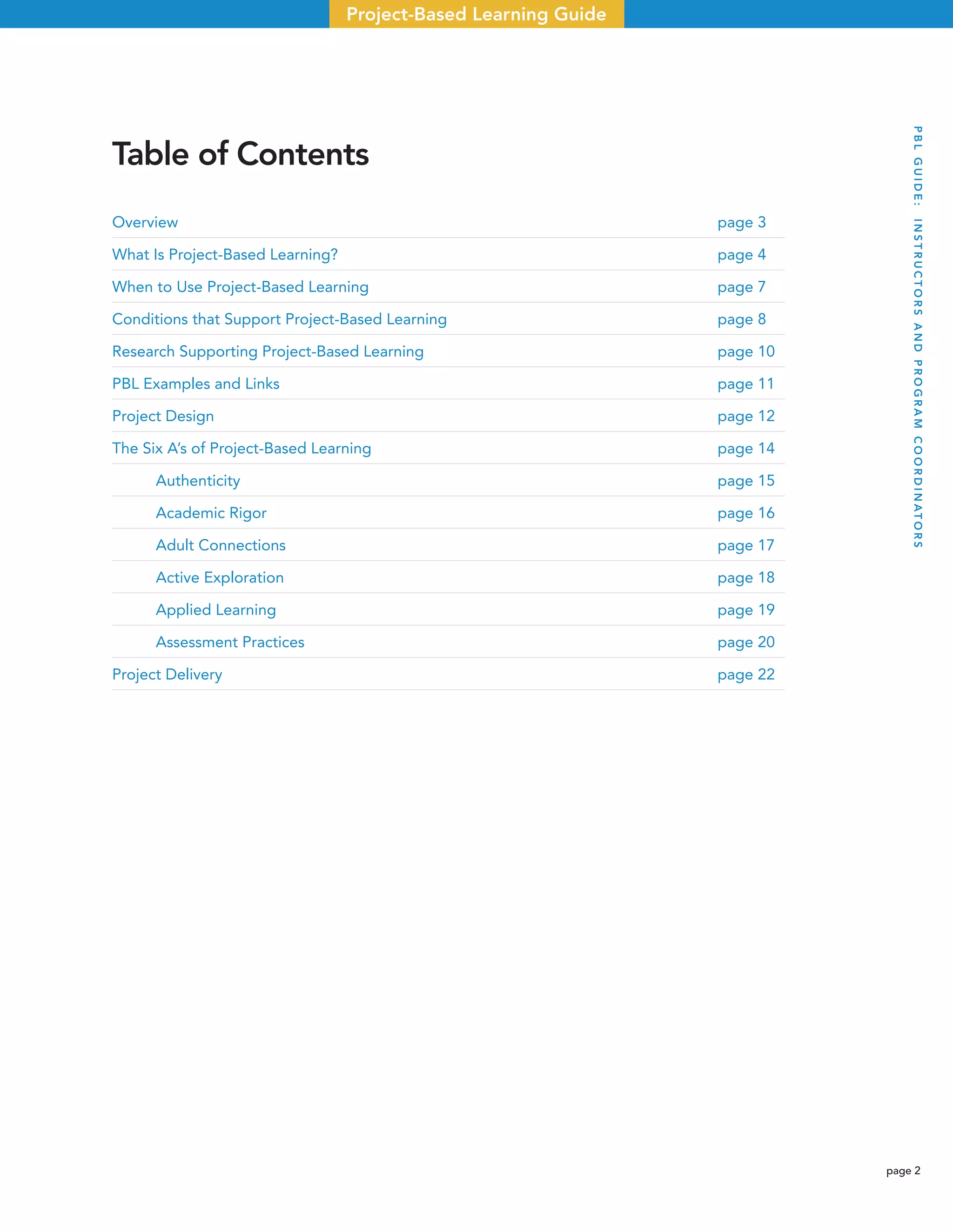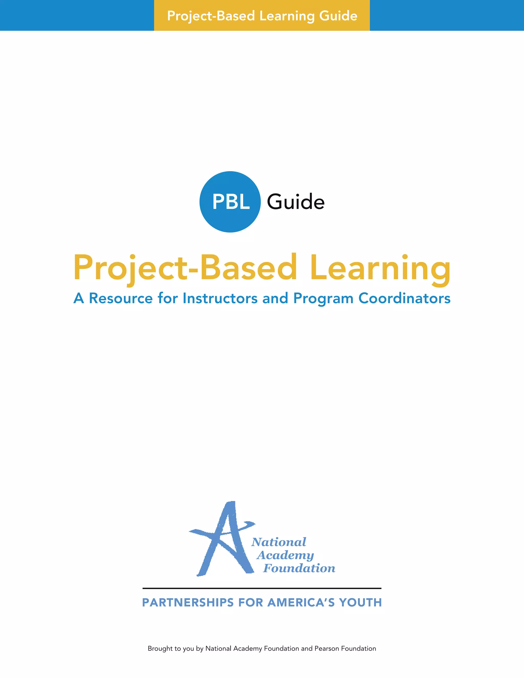This document provides an overview and guide to project-based learning (PBL). It defines PBL, discusses when to use it, conditions that support it, and research supporting its effectiveness. PBL engages students in learning knowledge and skills by working for an extended period of time to investigate and respond to an authentic, engaging and complex question, problem, or challenge. It is most effective when students have voice and choice, work with others, and produce a public product or presentation. Conditions that support PBL include a safe classroom environment, personalized learning, collaborative work, and involvement of community partners. Research shows PBL can boost achievement and help students develop skills like problem-solving that transfer beyond school.