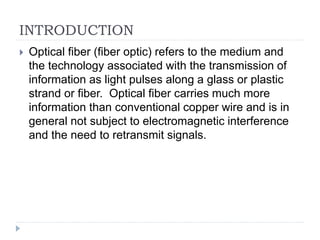 This document discusses the numerical aperture of optical fibers. It begins by introducing optical fibers and their use in transmitting light pulses for information. It then defines the acceptance angle and numerical aperture of a fiber, explaining that NA represents the light gathering capacity and depends on the acceptance angle. The document describes building an experimental setup to measure the NA of a fiber, including assembling wooden planks, laying fiber, and using a laser and photodetector. It presents the Arduino code, intensity vs distance graph, and calculations to determine the fiber's NA of 0.395 based on the experiment's results. Finally, it discusses improvements that could be made to the design and setup.