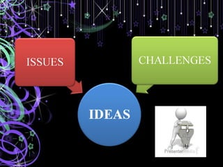 This document discusses issues and challenges with integrating information and communication technology (ICT) into teaching and learning in Malaysian schools. It notes that ICT has become an important part of education but integrating it faces problems. Specifically, it identifies issues like ensuring ICT's effectiveness and computers' inability to interact personally. Challenges include lack of ICT access in remote schools, distracting designs in presentations, boredom from repetitive aids, slow replacement of equipment, and insufficient skills and motivation among senior teachers.